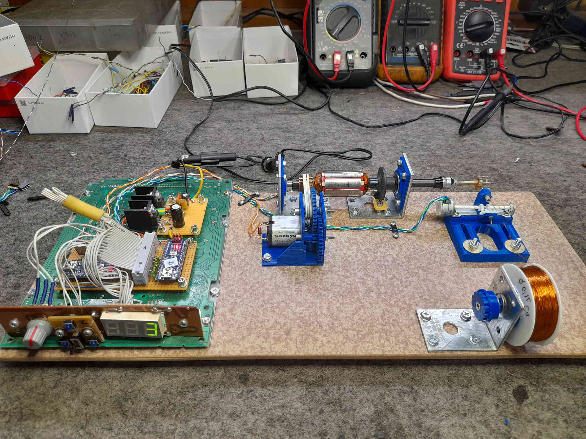 Szükségem volt egy eszközre amivel "szalonképes" (menet-menet mellé) mini tekercseket tudok készíteni. A 3D nyomtatott alkatrészek kivételével minden darabja fiókban talált alkatrészekből.