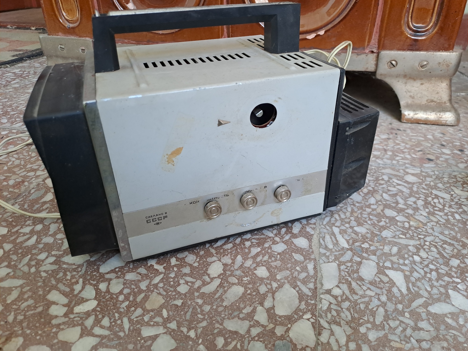 A szovjet miniTV egy VL-100 típusú készülék, képeken látható külső állapotban: fő hiányossága a csatornaválasztó, de ezen kívül mindene megvan szerintem (antenna ép!), habár a feliratok kopottak, és erősen poros a káva. Konnektorba bedugva bekapcsolható, a hangszóróból a zúgás szabályozható hangerejű, de a képernyőn semmi ("hangyafoci" sem) jelenik meg.