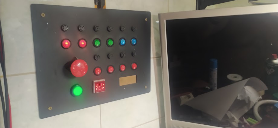 A fiamnak volt hasonló nyűgje a számítógépeivel, monitoraival, egyáb multimádiás eszközeivel. Nála úgy lett megoldva, hogy van egy 4 colos NEXTION kijelző, amire készítet egy programot, amin minden eszközhöz tartozik egy ikon, amivel ki-be lehet kapcsolni az eszközöket, illetve van egy ikon ami mindet kikapcsolja. A NEXTION uarton el tud küldeni egy 32 bites változót, ami jelen esetben elvben 32 kapcsoló. Persze ennyit nem használ. Egy PIC fogadja az adatot, amit aztán egyszerűen kitesz a kimeneteire, és két ilyen relémodult hajt meg. A többi már csak vezetékelés. A NEXTION és a PIC állandó tápon van, de a kijelző 1 perc után lekapcsol. Érintésre aktiválódik.