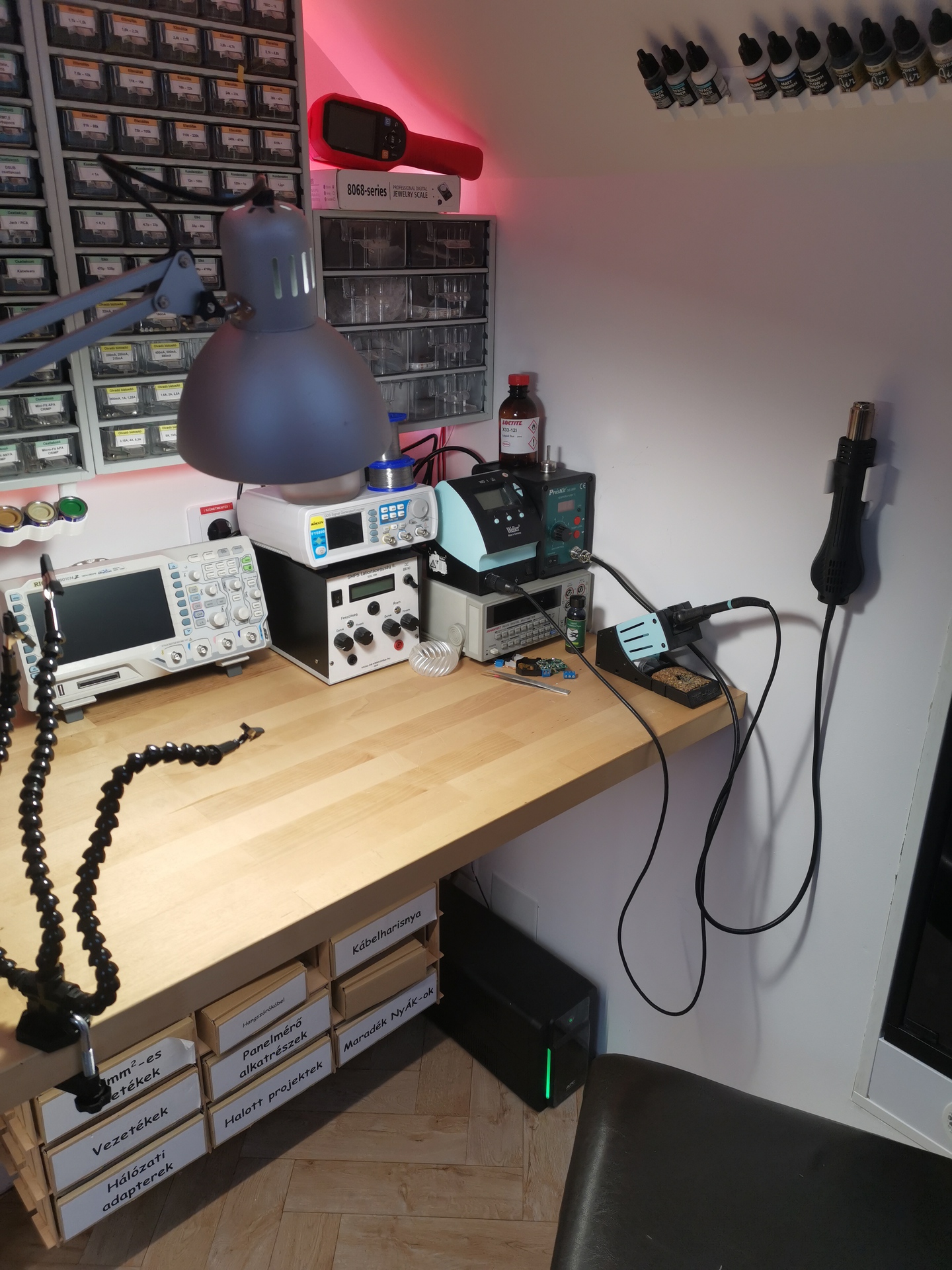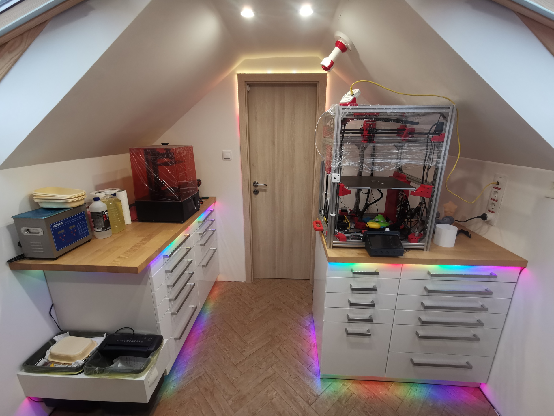 - A padló vinyl burkolatot kapott. - A resin-es asztalt megemeltem másfél centivel hogy aláférjen egy robotporszívó. Így semmi helyet nem foglal. - Két IKEA-s kukának készült egy tartókonzol a resin-es asztal oldalára, így a kukák el vannak emelve a földtől hogy a robotporszívó hatékonyabban tudjon takarítani. - Felszereltem a falra két új dugaljat és utólag behúztam minden szerelvénydobozhoz egy új kört, majd ezt megtápláltam egy 1600VA-es szünetmentes tápegységről. Így a 3D-nyomtatók, az asztali PC meg minden amit akarok szünetmentes áramforrásról üzemel. - Az asztal fölé beszereltem még két, az eddigi hattól külön kapcsolható spotlámpát illetve a munkalapra egy asztali lámpát. Mostmár aztán van elég fény! - Az asztal alá a HEStore-os dobozok tárolására szolgáló fa szerekezetek kerültek, köszönhetően Alkotónak. Ezek a kukákhoz hasonlóan nem érnek le a földre hogy alattuk el tudjon menni a robotporszívó illetve hogy könyebb legyen felmosni. - Egy airbrush kompresszor került a sarokba és az asztal alatt ki van építve egy pneumatikai cső meg csatlakozó hogyha festegetni akarnék. A 45 fokos falra pedig az airbrush-hoz szükséges festékek, alapozóknak nyomtattam egy tartót, hasonlóképp pedig enamel festékekhez is készültek tartók amik a szortimenterek aljára tapadnak mágnesesen. - A gyantás Anycubic nyomtatót lecseréltem egy sokkal jobb típusra (Phrozen Mighty 8K) és lett mellé egy ultrahangos mosó is. - Majdnem 20 méternyi WS2812-es LED-szalagot (1164db LED) ragasztottam az asztalokra, a szortimenterek köré meg az ajtóra. Mert miért ne. ![]() A világításról egy videó: Bővebben: Youtube A hozzászólás módosítva: Szept 14, 2024