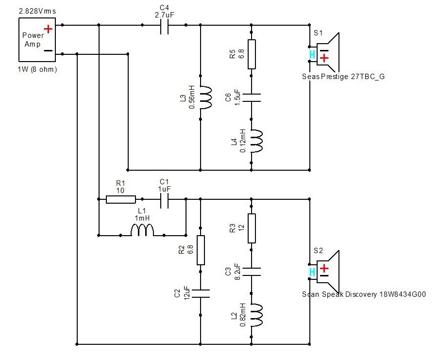 A váltóhoz kiinduláskor segítségemre volt Troels Gravesen oldala, aki ezzel a mélyközéppel épített már hangfalat, csak más magassal. Így a mélyközép szűrője kapcsolástechnikailag ugyanaz, de módosítani kellett az értékeken. A magas szekcióban pedig szintén egy másodrendű felüláteresztő szűrő van, egy notch szűrővel kiegészítve, ugyanis a magas +3dB-el jelszintjét úgy kellett csökkenteni, hogy az csak 3-10kHz-es tartományban szívjon, mert e fölött már a magas hsz jelszintje eléggé beesik, arra már nem szerettem volna, hogy hatása legyen.