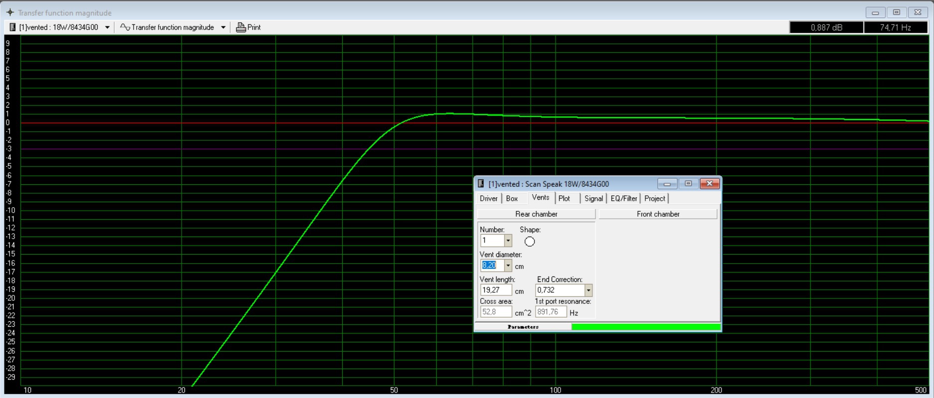 A mélyközepeket már jó néhány évvel ezelőtt megvettem, csak kicsit megcsúsztam ezzel a projektel (is). Akkor több hangszóró paramétereit - amik elérhetőek voltak, és viszonylag könnyen beszerezhetőek - vizsgálva, WinISD szoftverrel szimulálva keresgéltem, és végül ez a ScanSpeak és a Seas CA18RLY maradt, utóbbi kicsit drágább volt, a pénztárca meg akkor szűk, ezért lett végül ez a mélyközép. Qts alapján mindenféleképp egy olyan hangszóró kellett, ami ebben a dobozméretbe, reflexcsöves hangolással megfelelő lehet, tehát maximum Qts=0,5 jöhettet szóba.