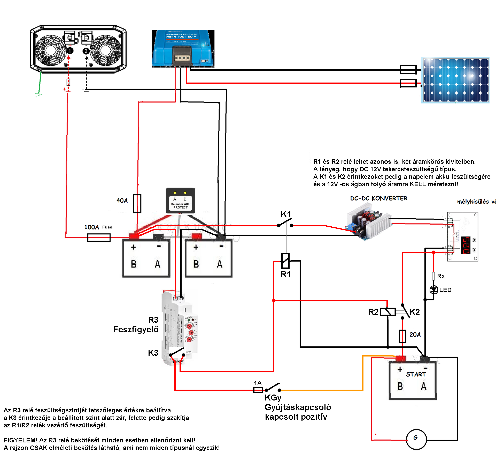 A DC konverter kimeneti feszültségét az akku csúcsfeszültségére kell beállítani, így az fog tölteni ha bekapcsolódik. Ha nincs napsütés, akkor az MPPT kikapcsol. Ha van némi napsütés, akkor az MPPT bekapcsol és szintén tölteni fog. Ha a napelem akkufeszültség elérte az R3 relén beállított feszültséget, akkor a DC konverter kikapcsol. Az eszközök elméletileg tudnak párhuzamosan működni. Itt egy példa, de kereshetsz még többet is. Ha nem vagy benne biztos, akkor tehetsz az MPPT és akku közötti pozitív vezetékbe egy relékontaktust, ami akkor szakít, ha a K1/K2 kontaktusok zárva vannak. Keresőkifejezések.: solar charge controller parallel connection, mppt charge controllel parallel connection A hozzászólás módosítva: Szept 22, 2024