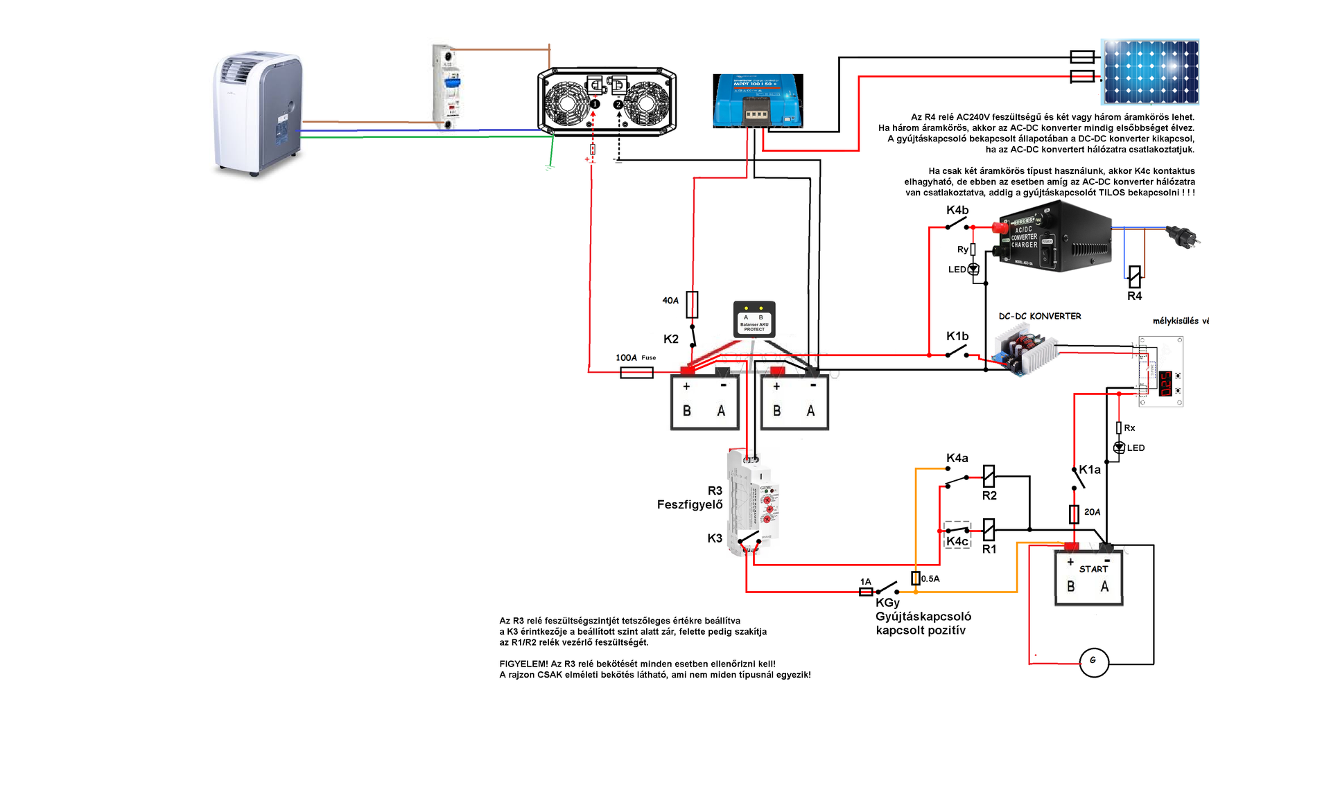 Jó lehet, csak még annyit módosítanék, hogy hálózati csatlakozásnál a 230V ne az inverterről menjen. Lesz rajt egy mobil klíma,ami 500-600W. Így elég egy kisebb teljesítményű töltő 24V-ra.