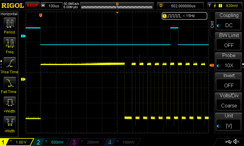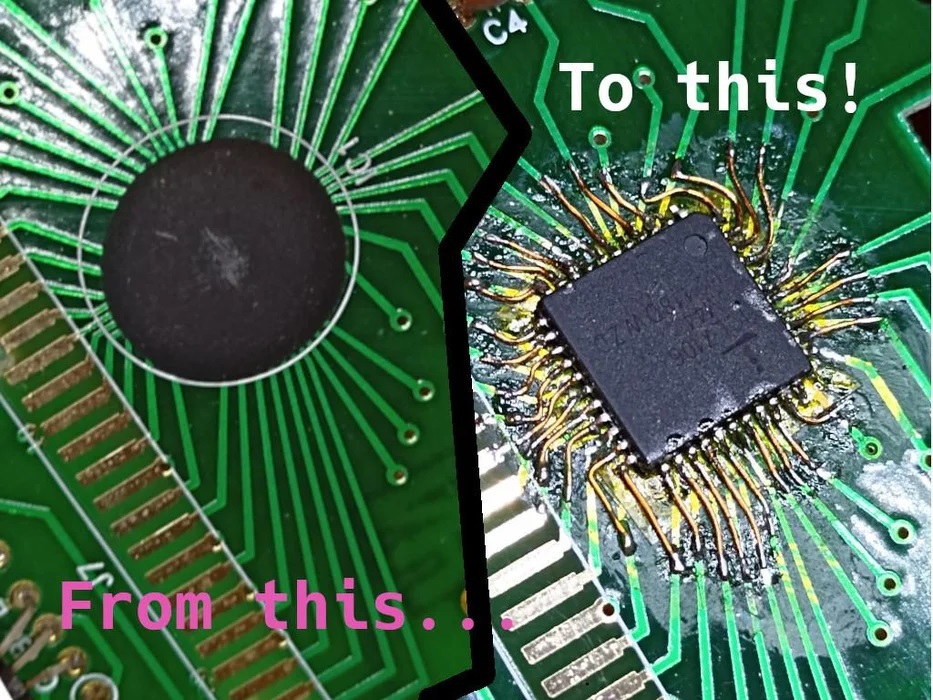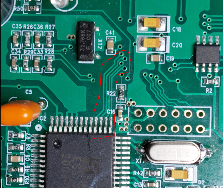 Bekapcsolva low battery hibát jelzet, ezért pár másodperc múlva ki is kapcsolt. Belül átnézve semmi látható nyom. A kapcsolás lényege egy Texas MSP430 mikrokontroller és egy Cyrustek ES51966 ADC. A low battery-t egy sima ellenállásosztóval érzékeli az ES IC, ott nem volt gond. A tápfeszültségek és órajelek is rendben voltak. És még az ES-re kapcsolt külső referencia is a leosztás utáni -200mV értéket mutatott. Akkor hol a hiba? Az MSP és ES között soros kommunikáció (CLOCK + STATUS) van. Az órajelet az MSP adja, és 3.6V-on működik. Erre rámérve gyanús lett. hogy az órajel szép 3.6V-os négyszög, de az adatvonalon sokkal kisebb a jel, csatoltam. Itt a szkóp GND az ES GND-jére volt kötve, ami valójában +2,5V a MPS GND-hez képest. Az STATUS vonal tehát csak kb 500mV-os jelet adott azt is magas szint közelében, ezért minden bit ami ott átment, azt az MPS magasnak érzékelt, beleértve a LOWBATT bitet is. Ez okozta a működésképtelenséget. Az MSP és ES között soros vonalak direktben mennek, felül semmi, alul pedig az MPS alá mennek át a via-k, szóval gyakorlatilag semmi alkatrész nincs a vonalakon, ami zárlatba mehet. A hibát az MSP sűrű lábkiosztása közötti zárlat okozta. Erről sajnos nem csináltam jó képet, de nagyító alatt látszottak kis Tin Whisker-ek. (Mi ennek a jó magyar neve?) Nagyon nehezen észrevehető, mert a flux sem lett lemosva gyárilag, és mindent beterített a fehéres maradék. Kétszer átmostam izopropil alkohollal, és a hiba elhárult. A hozzászólás módosítva: Szept 29, 2024