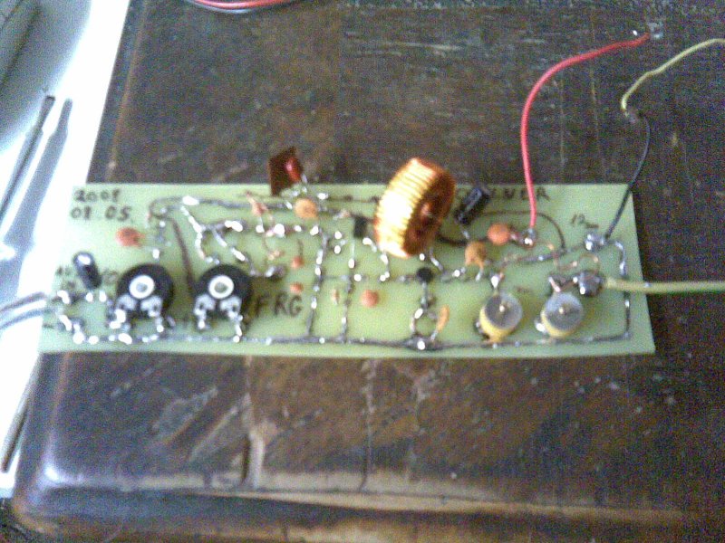Heló az adó beálitását nem izzóval végeztem mert nekem a kis áramu izzó(1,5v 20mA szűkséges a felvilannáshoz, soha még csak be sem izzott a wolfram szál,vagy ez nagy áramu izzó?)tehát a tekercsek alap helyzetben voltak,90 valahány mhz ad, elkeztem tekerni az 1 forgó kondit mikor megjelent az adó felharmónikusa akkor beálitotam pontosan a rádiót(tekerős rádió!ekkor még nemjó a zene minősége)elkeztem tekerni a 2-dik forgó kondit a zene minőség megjavult.(az adó közvetlen közelében rengeteg a felharmónikus de 6 m-re az adótol eltűnik mind csak a beálitott freki maradt meg)ez után teszt rádió kézbe és séta.Az én észre vételem az hogy minél hangosabb a felharmónikus annál meszebre tudtam adni.200 m jól 250 m a vége az adó a szobába a szekrény tetejére van téve ami kb a föltöl számitva 3,5 m magasan van.Antena: 80 cm sodrott réz vez 1.5 mm-es átmérővel. de nagyon instabil a freki az antenát 15 cm-el odéb teszem és már a freki el is mászott szóval rögzitetem az adót is az antenát is.igy egész használható.