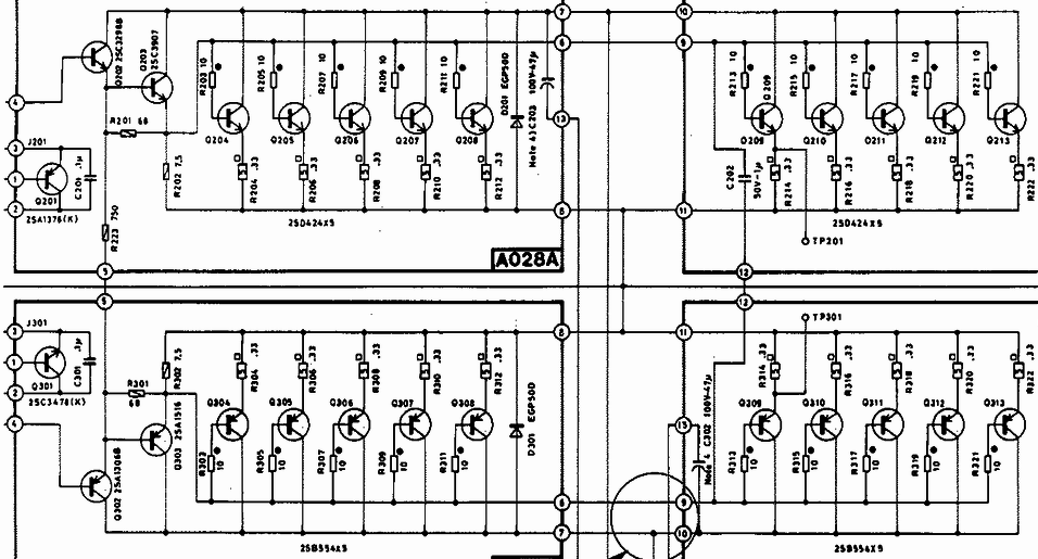 Ha a bemeneti darlingtonok emitter-ellenállásain már elfogadható feszültség esik, akkor a hozzá kapcsolódó áramgenerátorok is vélhetően jól működnek. A nyugalmi áram lecsökkenésének okát úgy vizsgálnám, hogy a teljesítmény panelről eltávolítanám a végtranzisztort. A Q203, Q303 és a 7R5 ellenállások pont elegendőek a DC egyensúly és úgy általában a driver vizsgálatához. (Ez régi vesszőparipám, gyakran ajánlottam már hibafeltárás alkalmával és mindig bevált.) Ha ettől megjavul, majd leírom mivel magyaráznám és mi a teendő. Tegyük fel megint leesik a feszültség a 3-4 csatlakozási pontok között. Ellenőrizném a gerjedést és a kimeneti DC alakulását. Ha ezek rendben, meg kell mérni a VAS-ban folyó áramokat, mert ebből határozható meg a hiba oka. Tehát R125, R126 feszültségesése és Q201, Q301 bázis-emitter feszültsége.