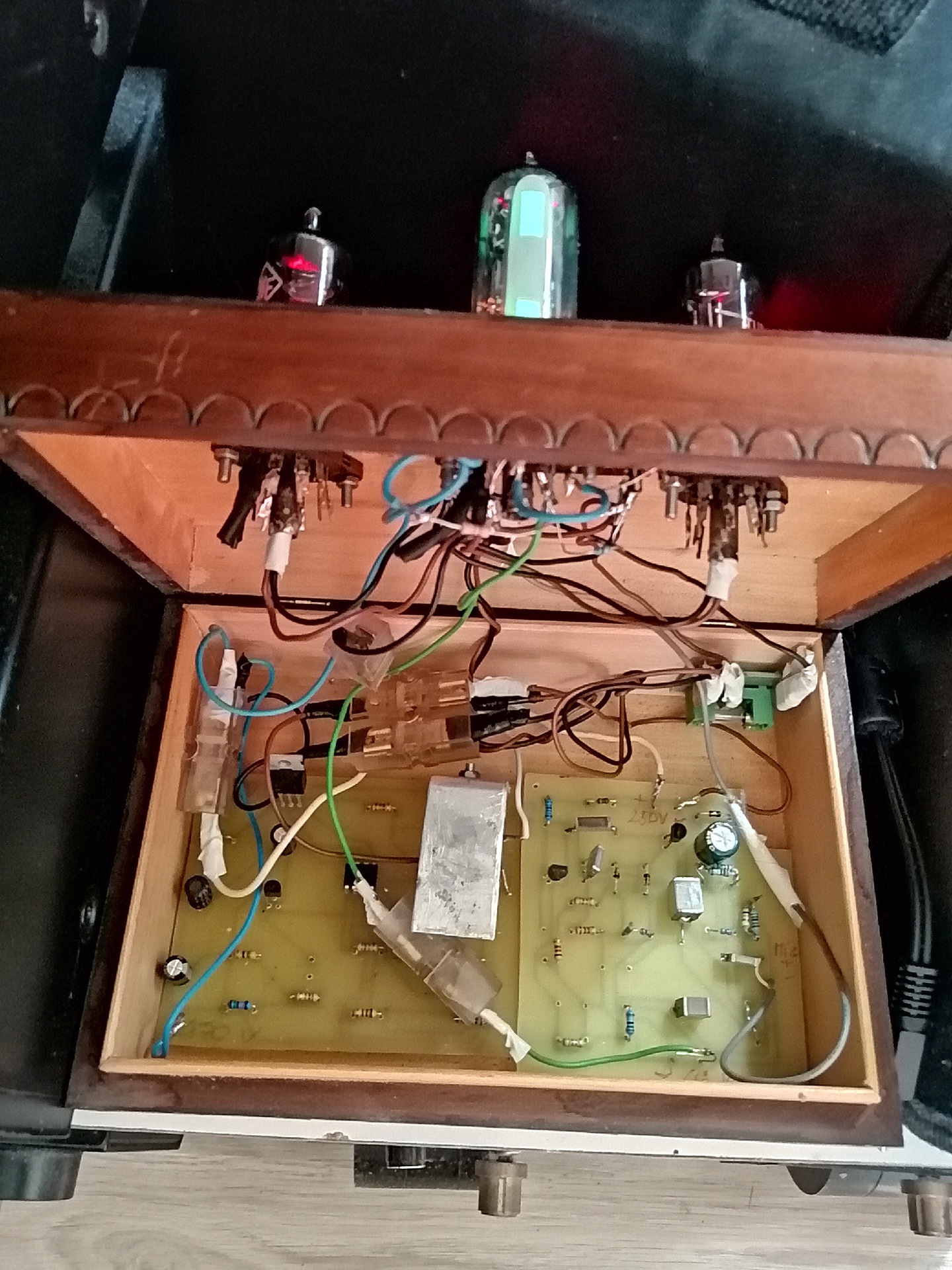 Mikrofonos kivezérlésjelző em84 csővel, kapcsolóüzemű táppal, bolhapiaci fa díszdobozba épitve. A plusz 2 cső csak dísznek van.
