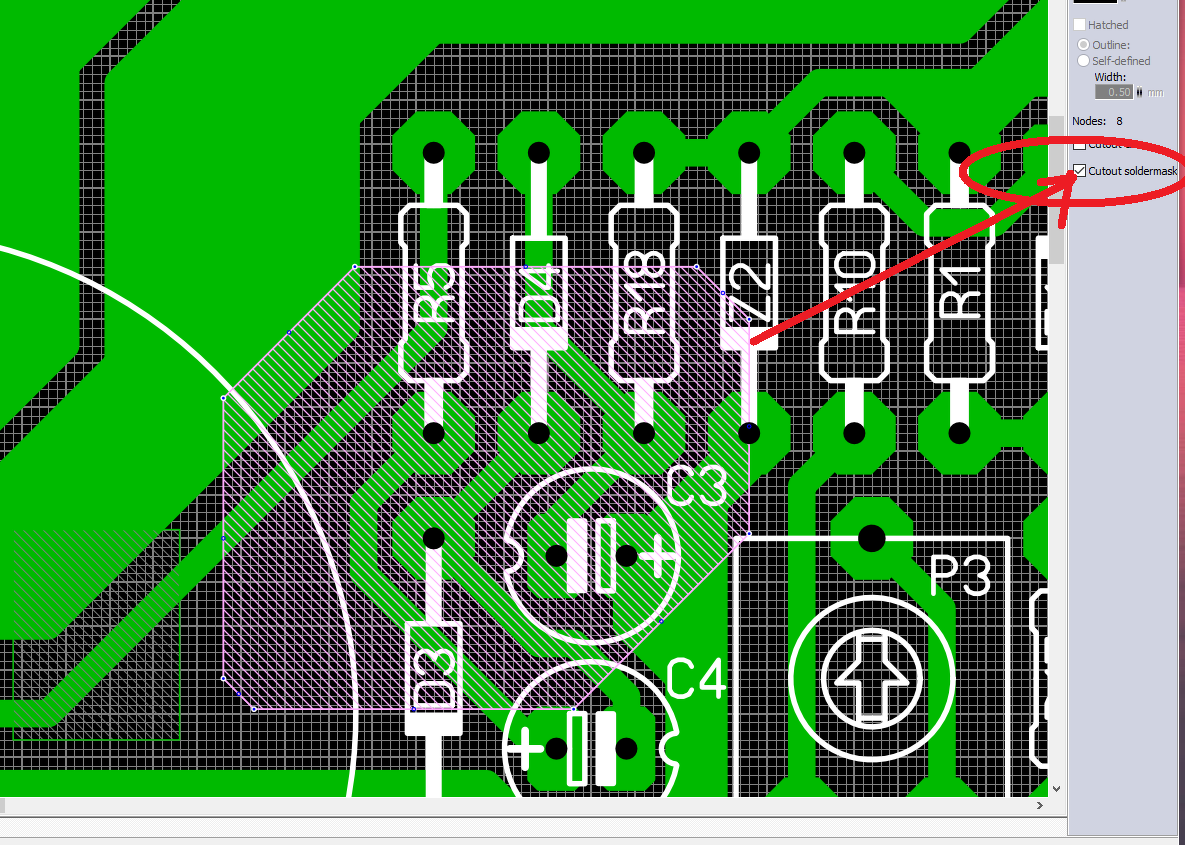 Azt tudja egyébként valaki, hogy a solder maskot el lehet-e valahogy távolítani egy megadott területről? Az OK, hogy mondjuk egy vezetősávról kattintással kivehető, de ha pl. egy 1×1 cm-es területen nem szeretném, hogy legyen, az megoldható valahogy?
