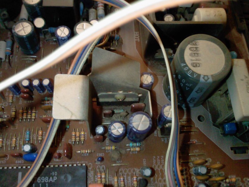 Na vannak fejlemények.Azt elfelejtettem irni, hogy ha nyomkodtuk az antenna kábelnál akkor sokszor helyrejött de ha elengedtük akkor megint csíkozódott.Ebből arra következtettem, hogy a panel közepe körül lesz a gond mert ott feszül meg mikor megnyomom az antennánál.Bekapcsoltam és elkezdtem kopodtatni egy műanyag pálcával az alkatrészeket és egy hütőlapos IC (lásd a képen) tünik hibásnak.Amikor a hűtőfelületet kopogtatom rögtön csikozódik minden egyes koppantásra.Ez egy 9 lábú IC sajna tipusjelzést nem látok rajta.Na talán ezekből az infókból tudsz valamit segíteni.Előre is köszi.