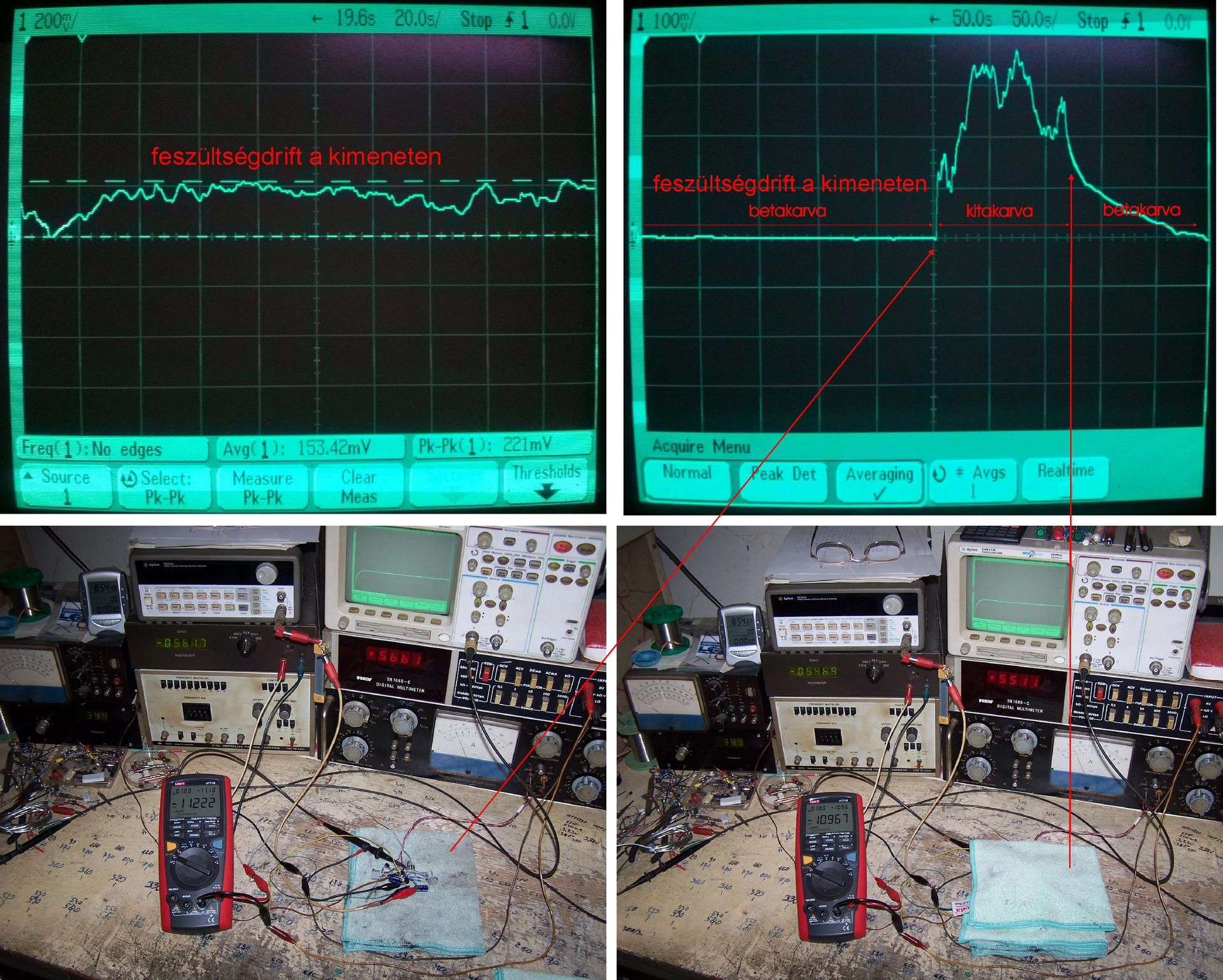 Napokig nem értettem miért ilyen nagy a drift a kimeneten. Bár a földelt emitteres fokozat nyílthurokban erősíti a bemeneti tranzisztorok zaját, de ez a 220mV ingadozás akkor is sok. Mindenre is gyanakodtam, majd arra gondoltam mi van akkor ha az a meleg levegő "kavarog" a tranzisztor körül amit saját maga termel. És mi van akkor ha ezt a légáramlást megszüntetem. Ez a mikroszálas rongy jól hőszigetel. Az egyikkel az asztallaptól hőszigeteltem el, aztán rádobtam a másikat. És volt nagy csodálkozás. A drift úgy megszűnt mintha elfújták volna és úgy beállt kimeneti fesz 0V-ra, mint a cövek. Ez az egyik érdekesség amit szerettem volna megmutatni (mindenféle bemeneti fokozatra vonatkozik ez a dolog). Talán nem lenne ostobaság műgyantába beönteni a panelt, vagy valami ragaccsal bekenni. Majd a legvégén elszórakozok vele. A hozzászólás módosítva: Okt 10, 2024