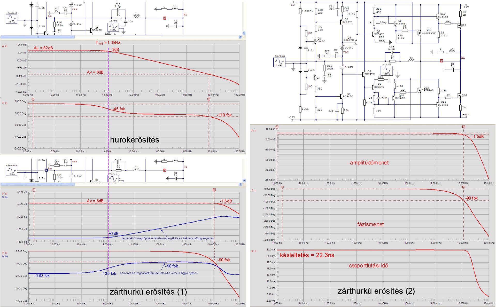 meghatároztuk a hurokerősítés diagramjából a fázistartalékot (70 fok) és a visszacsatolási-tényezőt (ami kb. 80 dB kisfrekvencián). Az amplitúdó karakterisztika most nem fog érdekelni bennünket, csak a fázismenet és a futási idő. Nyílthurkú erősítés: Ugyanazt a fázismenetet látjuk, mint a hurokerősítés Bode-ján (előző hsz.) A domináns pólus frekvenciája itt is 1.1 kHz-en van (itt -45 fok a fáziskésés). Most picit számolgatunk. Már megállapítottuk, hogy az első négy tranzisztorból álló fokozat (Q1-Q4) kimeneti ellenállása a szimulátor szerint 330 kOhm. Ezt a fokozatot most "beterheli" Q5,Q6 emitterkövető. Visszaszámolva teljesen életszerűnek mutatkozik ha 140 kOhm-ra esik a fokozat kimeneti ellenállása. A bemeneti fokozatot (Q1, Q2) most nem a Miller-kapacitás terheli nagyfrekvenciásan, hanem az állandó értékű C6 (1 nF). 1/2pí*140k*1nF=1.14kHz Ennek az "RC" tagnak az időállandója: rki*C6 = 140k*1nF = 140us. Ez a futási idő, azaz a késleltetés. Zárthurkú erősítés: Azt látjuk, hogy az összegzőpontban a fázismenet "átfordul". Most a domináns pólus frekvenciáján (1.1 kHz-en) +45 lesz a fázistolás (a fázis "siet"). A futási idő diagramján azt a törvényszerűséget is észrevesszük, hogy nem csak a zérusoknak van negatív késleltetési ideje, hanem minden visszacsatolt rendszernek - akkor is ha rendszerben csak pólusok vannak (egymást követő aluláteresztő RC tagok). Ha a nyílthurkú erősítés futási idejét összeadjuk a zárthurkú erősítés összegzőpontjában mért futási idővel (-140 us + 140.023 us) kapjuk meg a visszacsatolt rendszer késleltetését. Persze ez így rettenetes pongyola módon van megfogalmazva és nem teljesen igaz - sőt egyáltalán nem igaz - de a dolog lényegét így könnyebben átláthatjuk/megérthetjük. Innen tovább is gondolhatjuk a dolgot. A bemeneti összegző(csomó)ponton csak egyetlen feszültségszint lehet egyetlen adott időpillanatban. A visszacsatoló tag(-okon) a kimenet felől érkező áram és a bemenet felől az áramgenerátor áramának összege ejt feszültséget a bemeneti impedancián. A bemeneti összegzőpont feszültsége a végfok (a visszacsatolt rendszer) felső határfrekvenciájáig (11 MHz-ig) előre siet. A törésponti frekvenciáig többet, felette jóval kevesebbet. Mivel ez a feszültség előbb jelenik meg a bemeneten mint a kimeneten, akkor mondhatjuk (mondhatnánk) azt is, hogy a rendszer "jósol" és ez félig-meddig majdnem igaz is. De úgy is átfogalmazhatjuk a dolgot, ha a kimeneten később jelenik meg a jel mint a bemeneten, akkor a rendszer késleltet. A következőkben megvizsgáljuk, hogy ebből a paradoxonból melyik igaz: a "jóslás", vagy a késleltetés. Vagy mindkettő?