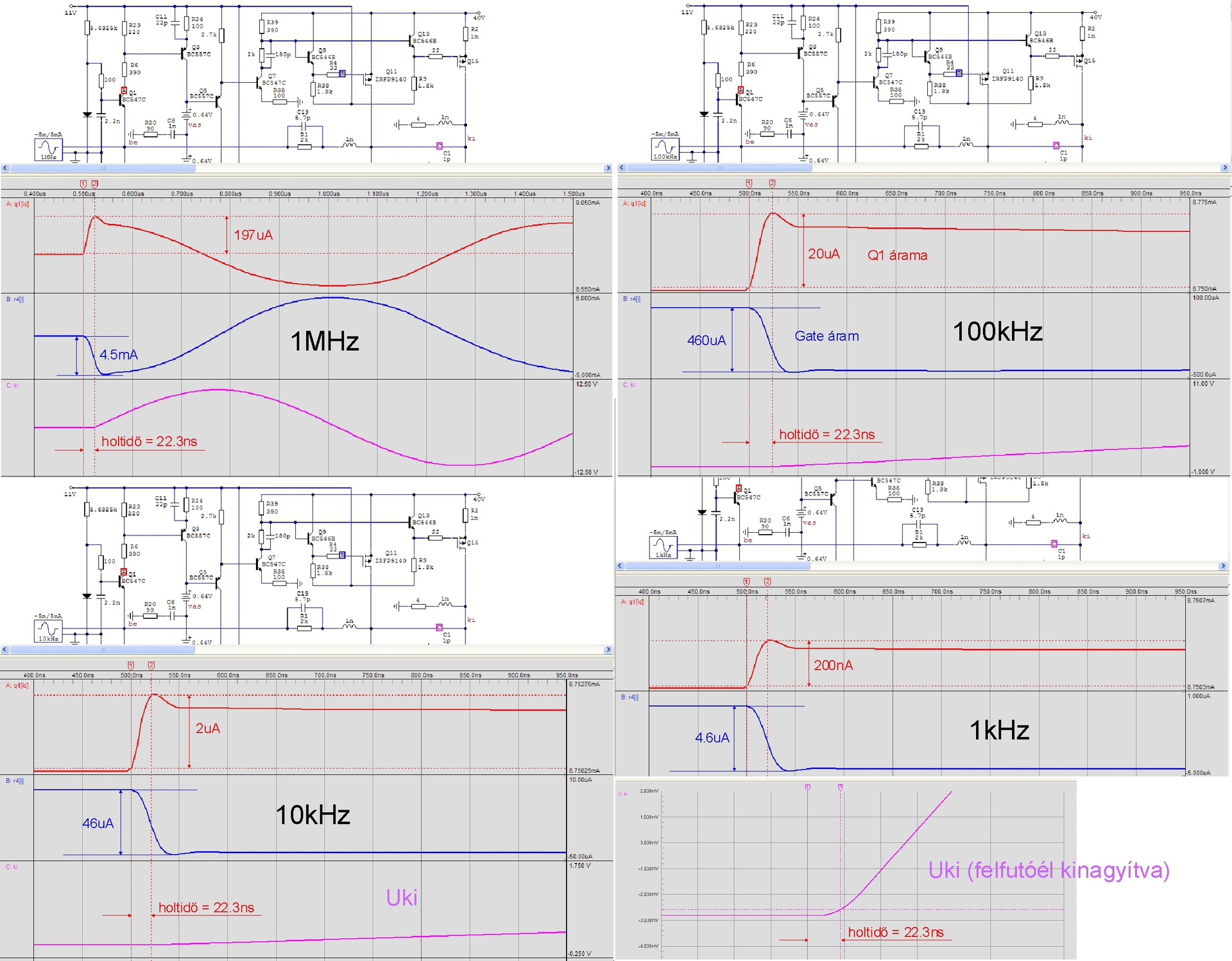 Klaus Fieger: Szabályozástechnika ("compozit"-tól kaptam). "Holtidős tag" és "ugrásfüggvény". A két- vagy többtárolós arányos integrálótagoknak van holtidejük. A fenti erősítő kapcsolásban egyik tárolótag az integrátor (C6), másik a MOSFET bemeneti kapacitása. A szimuláció mutatja a holtidőt (10 ns) és a késleltetést (22.7ns). De mutatom a Hawksford holtidejét - bemeneti aluláteresztő nélkül - szkóp fotókon. Kisjelűen 64 ns. Elég jól kivehető, hogy van neki ilyen. Tehát nem értem ezt a rövid tőmondatot, hogy: nincs holtidő... Idézet: „Ha megnézzük a highend szféra erősítőit - amelyeknek illene azért fülre is jól szólni - nem nagyon látok nagyon gyors példányokat...” Megtévesztő lehet ezeknek highend erősítőknek a mért frekvencia-átvitele. Nem nagyon tudok olyanról amelyik ne aluláteresztő szűrővel kezdődne. A végfok sebességét szerintem a bemenettől a kimenetig mért zárthukú erősítésének a sávszélessége mutatja meg (ha no-nfb, akkor csak "simán" az erősítés sávszélessége). Mutathatnál/mondhatnál egy-két példát lassú highend végfokra, olyanra amelyik ennek ellenére "jól szól". Természetesen analóg végfokra gondolok, nem PWM-re, mert azok másik állatfaj. A linkeket sajnos nem tudom elolvasni. A diyaudio-t már nem tudja a gépem magyarra fordítani. Azt mondja elavult a böngészőm. A laptop és az asszony gépe azt keresgéli robot vagyok-e, vagy netán ember. (Magam sem tudom : ).)