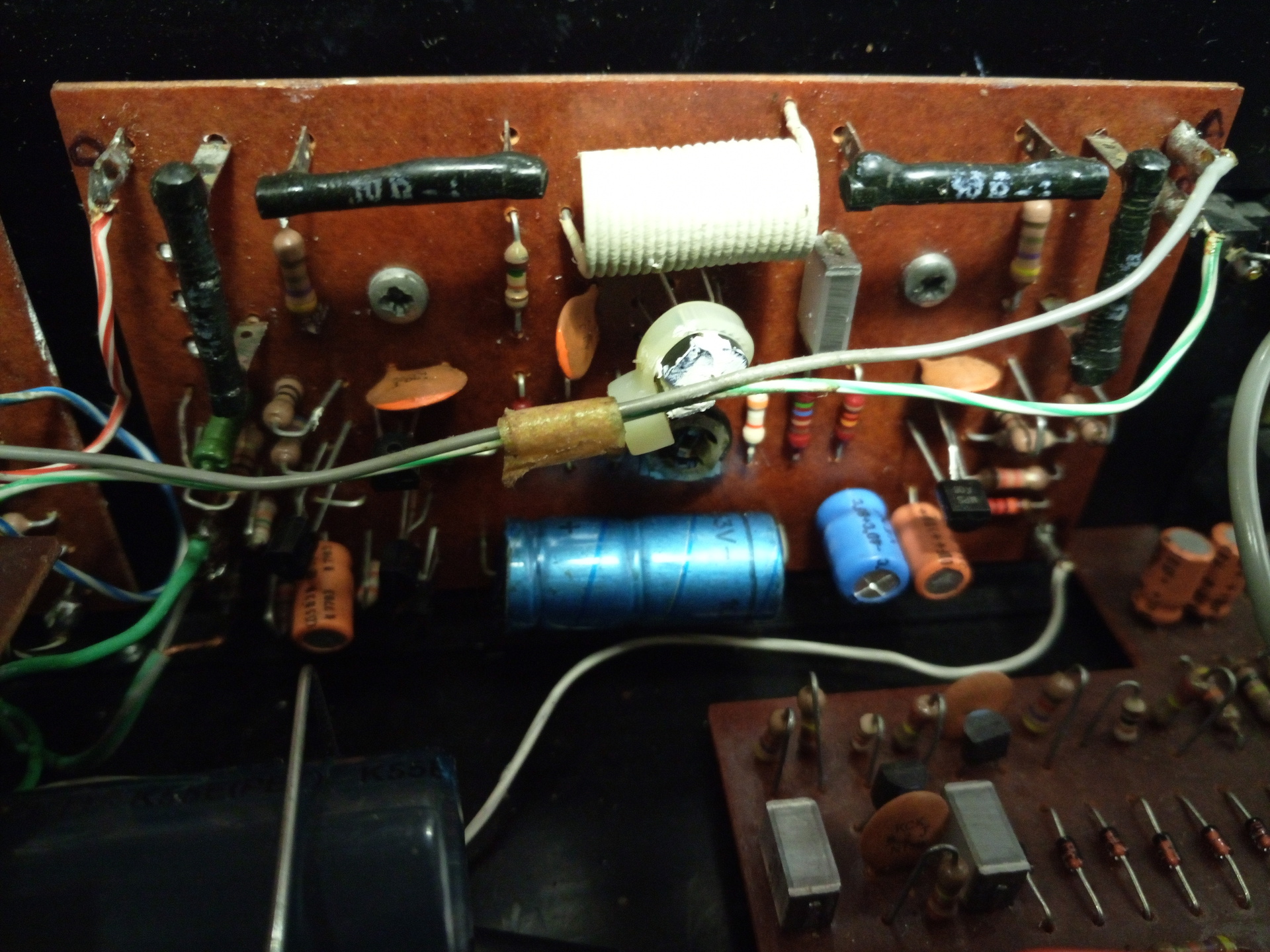 3. A tápokban: C39 470µF/40V helyett 2db 470µF/63V-os elkó került, a C35 helyébe szintén 220µF/63V (biztonságból, mert szerintem a benne lévő kondik elég közel jártak max névleges feszültséghez. C10 az AM panelen 47µF helyett 100µF/16V szárazelkó lett, C24 (szeteró dekóder) 10µF helyett 470µF/25V került. (ez általában jót tesz a sztereódekóder tápjának). C17 a szűrőpanelen 470µF helyett 1000µF-re lett cserélve, a C7 a hangszínés hangerő panelen meg 22µF helyett 330µF-ra.