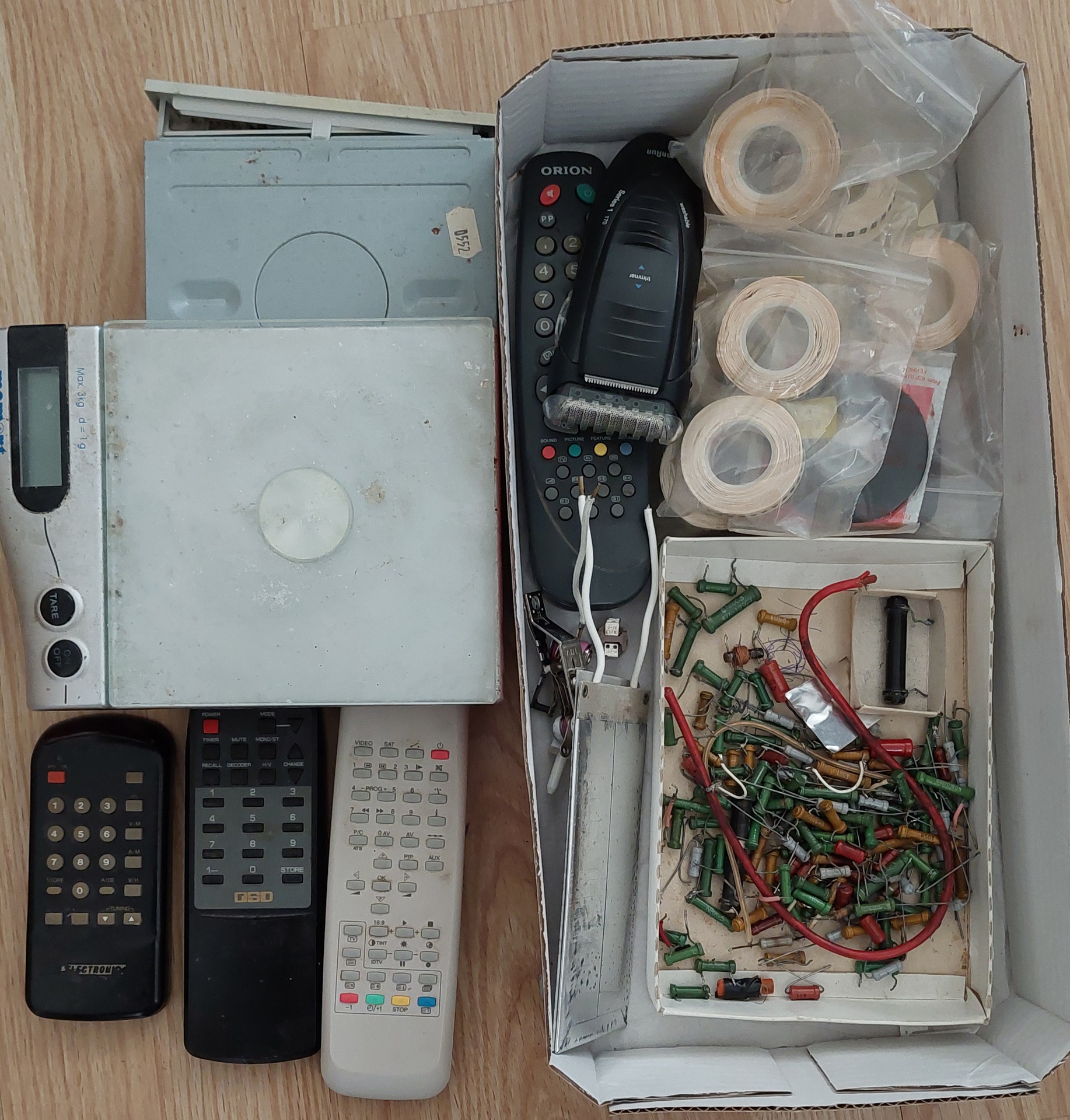 Sziasztok, csak személyes átvétel, egyben. Távirányítók, retro ellenállások, rossz konyhai mérleg, CD mechanika, foglalkozós, de működő kukorica pattogtató, rossz rádiós magnó, vasaló NYÁK vasaláshoz stb.2db nyári gumi, nem elektro téma, szóval az opcionális, ha kell...