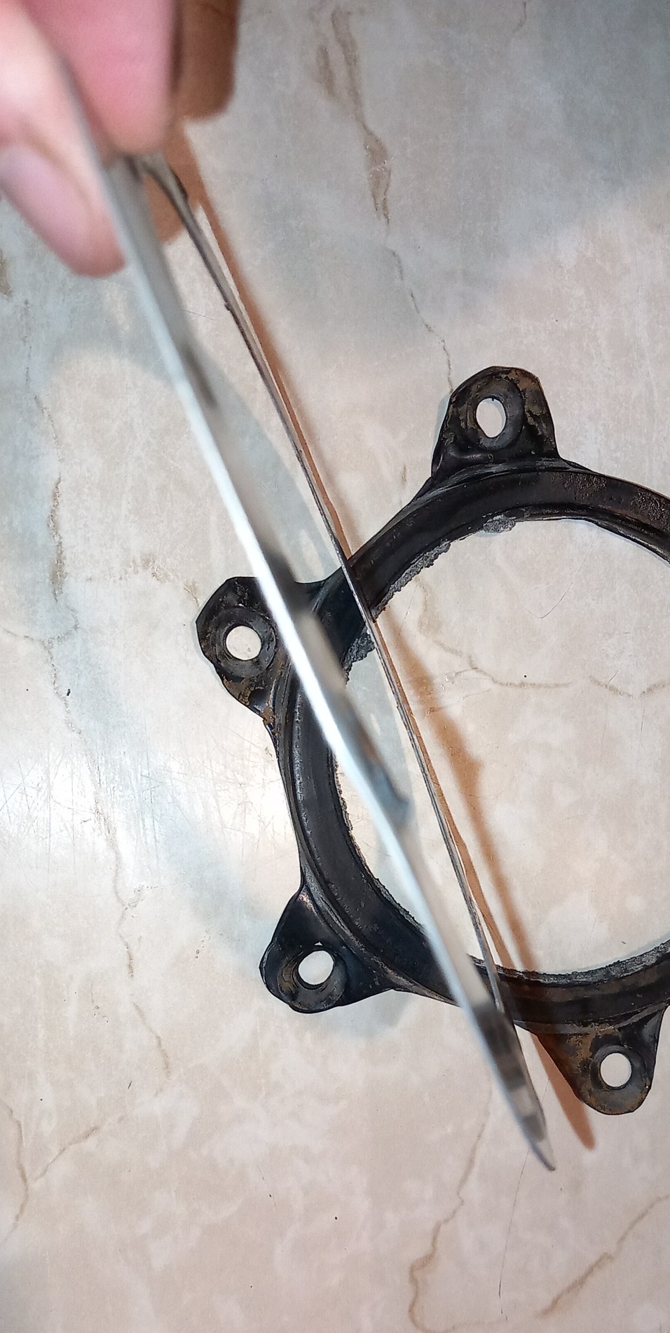 Az alaplemez - tömítés - fémalátét így volt a sorrend. De ahogy kinézem a tömítés és a fémalátét nincs kapcsolatban csak a füleknél.