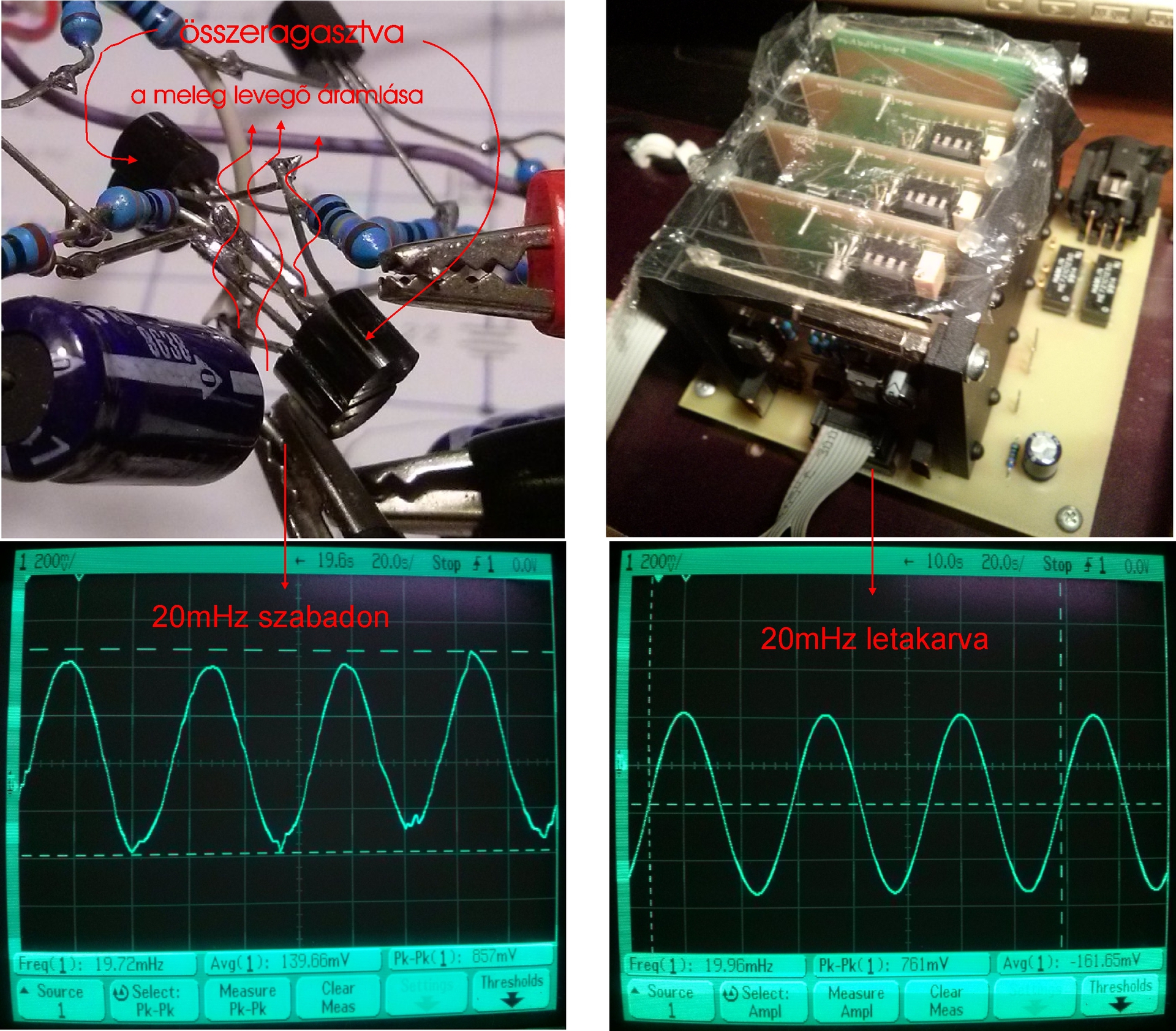 Az összemontírozott képek csak illusztrációk, a lényeget próbálom velük kifejezni. Ezt a termikus torzítást szerintem sokkal komolyabban kell venni, mint gondolnánk. Igaza volt Sípos Gyulának és mégsem figyeltünk oda rá eléggé. Amit leírok, az ismét a saját szubjektív véleményem, a saját hallásommal, a saját láncomon és nem kell készpénznek/komolyan venni. Most azt gondolom, hogy amit jobb híján úgy nevezünk, hogy "félvezetős hang" (pejoratív értelemben), azért a hangért jó nagy részben a termikus torzítás a felelős. Néhány hete elgondolkodtam ezen a légáramlás dolgon, hogy tulajdonképpen ezt a kisfrekvenciás feszültségdriftet a kimeneten, a tranzisztorok körül áramló levegő okozza és ha ezt a légáramlást valamilyen módon megszüntetem, a drift is eltűnik a kimeneten. Első körben eljutottam addig az előerősítő kísérletben, hogy letakartam a paneleket egy ronggyal. Erről már írtam. "züm-züm" a második kép címe, mert hát kicsit zümzümnek kell lenni ehhez : ) Aztán tesztelés közben arra gondoltam, hogy a levegő még mindig cirkulálhat a panelek között. Mi lenne ha teleszórnám a modulok közötti teret valami apró szemű izével, ami jó szigetelő, kicsi a dielektromos állandója (tehát szerintem nem lehet műanyag), a hőt meg úgy vezeti ahogy - ott úgy sincs meleg. Van kéznél itthon pl. rizs. És igen. További tisztulás a hangképben minden irányban. A mélye viszont nem igazán tetszett, túl sok lett és az igazán mély hangok (pl. üstdob) "hordósak" lettek. A rizs túl könnyű és rezegni tud - gondoltam. Másnap irány a díszhal kereskedés, ott elvileg árulnak mindenféle kavicsokat. Nem röhögött a kereskedő amikor mondtam, hogy erősítőbe kell. Vettem kétfélét... ez a márvány zúzalék volt szimpatikusabb (tudományos alapon). Nagyon türelmesen kimostam (az asszony mosta át), mikróban kiszárítottam, aztán rizs ki, márvány be. Aztán tegnap késő estig zenehallgatás. Ezt a hangot kerestem. Állítom, hogy a javulás mértéke az első (letakaratlan) állapothoz képest nagyobb - vagy legalább akkora - mértékű, mint amikor a Yageo ellenállásokat cseréltem Beschlag-ra és az SMD kondikat Kemet-re. Aztán még tovább gondolkodtam (tudom nem kellene). Ez a termikus izé magyarázat lehet arra, hogy egyesek miért állítják azt, hogy a visszacsatolókörben lévő csatolókondi jótékony hatással van náluk a mély hangokra - és akkor is beleteszik a kondit, ha kapcsolás ezt egyébként nem kívánná meg (nélküle sem lenne DC a kimeneten). Ha a szimulátorba az első fokozattal sorosan "beteszek" egy zavarójelet, ezt az erősítő zárthurkúan erősíti. Tehát mondjuk 20-szoros visszacsatolt erősítésnél, a bemeneti fokozat kisfrekvenciás termikus zaja is a hússzor akkora lesz a kimeneten mérve. A csatolókondi kisfrekvencián egységnyi erősítésűre csökkenti ezt a termikus zajt. Az igazán mély hangok (szerintem) nem jók lesznek ettől a "termikus zajcsökkentéstől", csak másmilyenek. Gondolatébresztőnek szántam ezt a kis szösszenetet... mint írtam nem kell komolyan venni (de ajánlott).