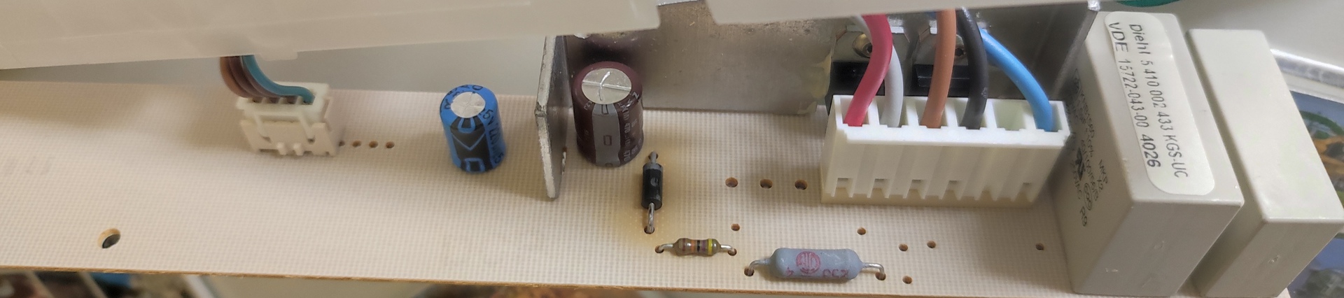 Szia! Elsőnek a panel végén a két nagy szögletes kondit vedd ki és mérd kapacitásra! Ha kisebbek(jóval),akkor csere. A feszültségérték és kapacitás mellett fontos az X2-es jelölés!! A két kerek elko-t is megmérheted,de valószínű inkább a két előbb említett lesz hibás.