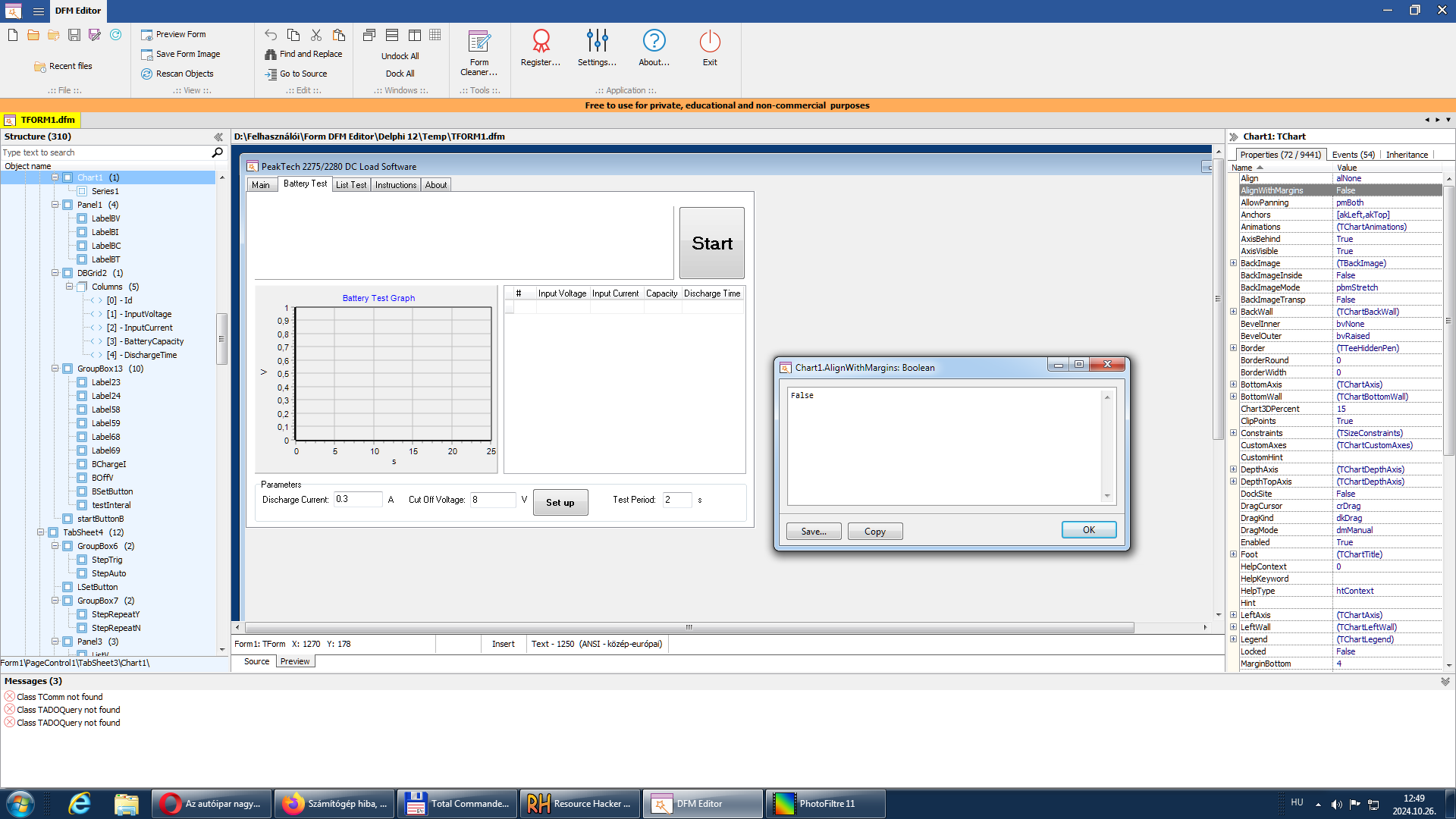 Az eszközzel kapcsolatban viszont feltűnt az, hogy az elemek tulajdonságait (Properties rész) a jobb oldalon egyáltalán nem engedi változtatni. Hiába kattintok rá duplán, felugrik egy ablakban ugyan az értéke, de átírni nem lehet.