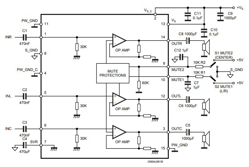 Van egy TDA7497 típusú erősítő, ami egy Sony tévéből származik. Csatoltam az adatlapjából az ajánlott kapcsolást. Mikor nincs némítás, ha a 10-es láb 5V-ot kap, vagy amikor le van kötve a földre? (most nem kap 5V-ot)