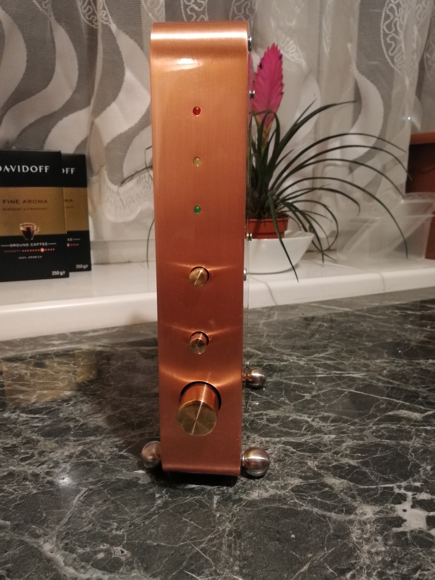 A külső keret egy tömör vörösréz profilból hajlított idom, a többi oldal pedig sárgaréz lemez?Mert ha igen, akkor ez nem egy spórolós megoldás, őrizned kell, nehogy valaki beugorjon érte és leadja valamilyen felvásárló helyen.