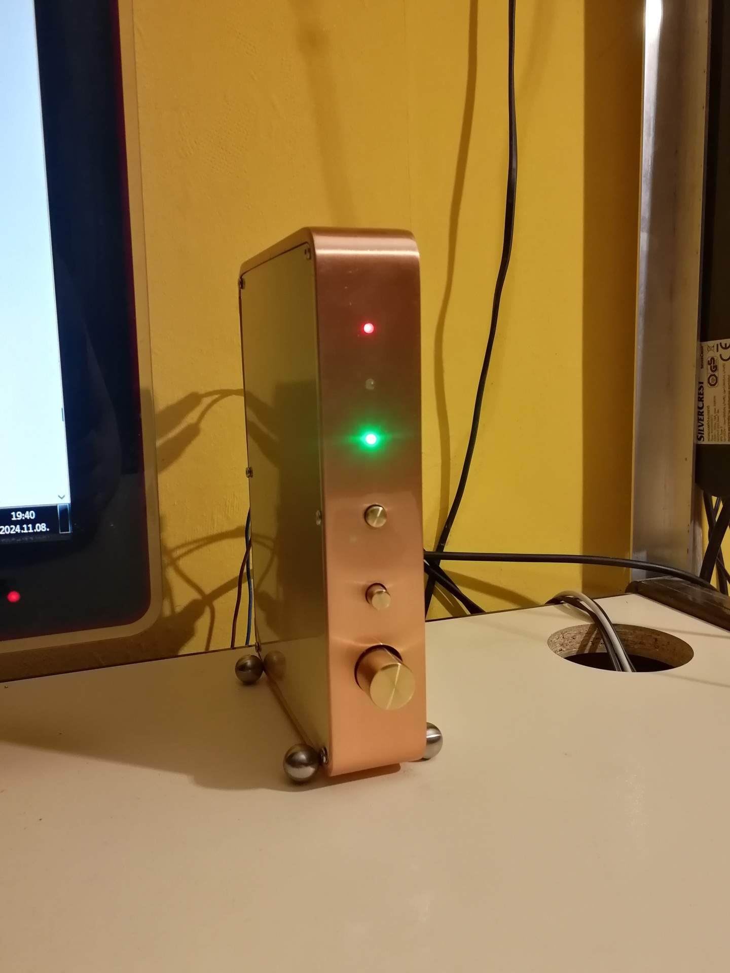 - A felhasznált anyagokhoz képest egész kulturált kinézetű a végeredmény. - A hálózati oldal határozottan el van választva a kisfeszültségű részektől. - Van benne saját gyártású panel is. Talán annyi, hogy én 1db sztereo potit használtam volna, gondolom úgyis együtt fogod tekergetni a kettőt..