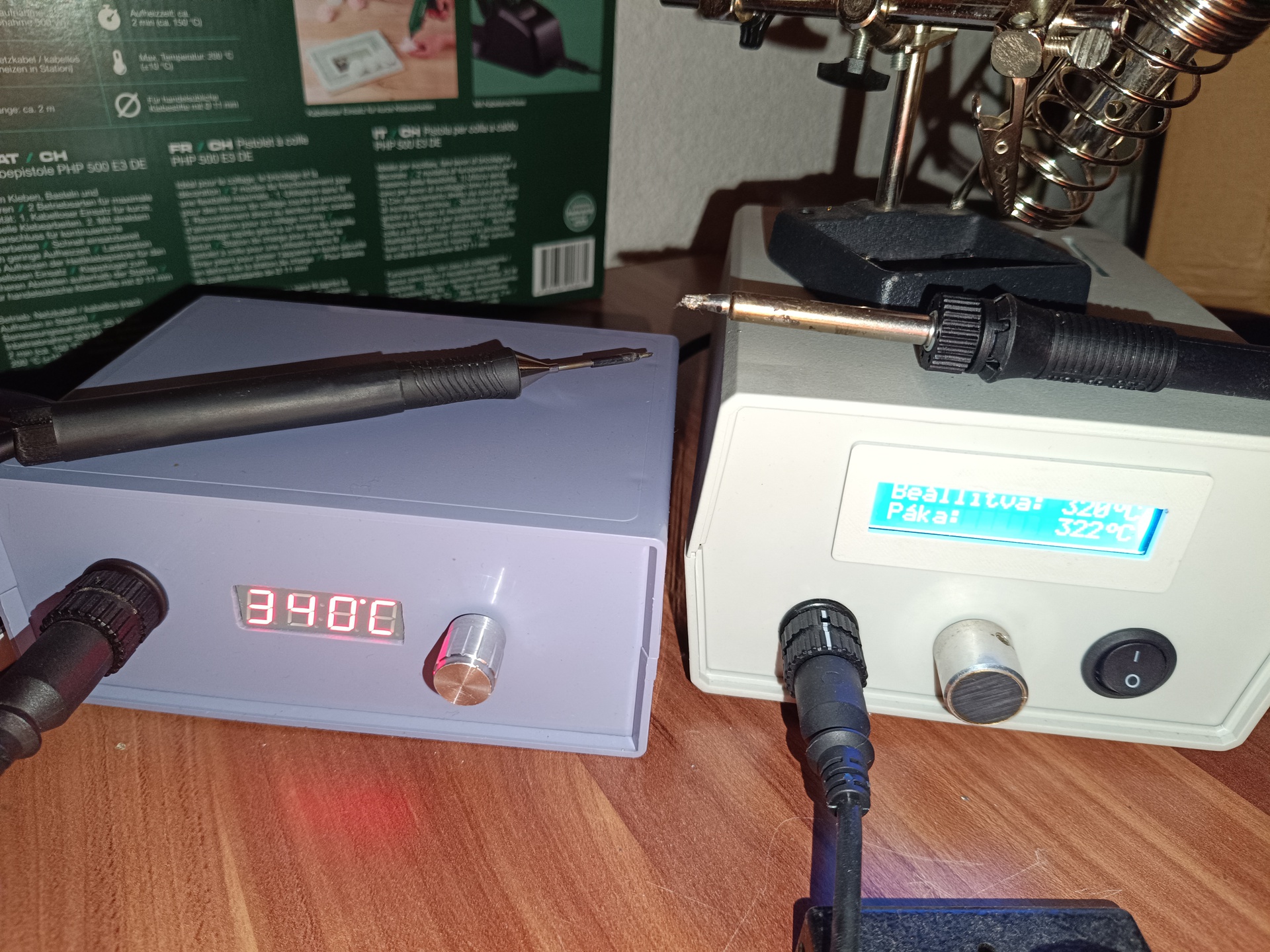Weller WMRP-WMRT forrasztó állomásSziasztok!Megépült egy forrasztó állomás, illetve kettő, Weller Wmrp (RTM hegy), és Wmrt (csipesz páka) eszközökhöz alkalmasak. Az egyes képen látható saját tervezés. Azonban a világhálón találtam egy teljesen kifejlesztettet, Menü rendszerrel, Stand-by állapottal, Reed relé a nyélben, hidegpont kompenzáció, stb., mindenféle beállítási lehetőséggel ellátott kapcsolást, így az lett a nyerő. Ez az állomás használható csak az RTM heggyel is, illetve gyári pákával is. Menüben ez is állítható. A páka nyelem 3D nyomtatással készült. 12V DC tápegység látja el az áramkört, igy akkuról is használható akár. Páka hegyekben benne van az érzékelő (D höelem), és a fűtöelem is, pár másodperc a felfütési idő, 3.5-es jack csatlakozóval van ellátva, így használható könnyedén gyári nyél nélkül is. Az áramkört PIC vezérli. Végezetül a WSP-80-as állomásom is új házat kapott (6.kép). A hozzászólás módosítva: Nov 14, 2024