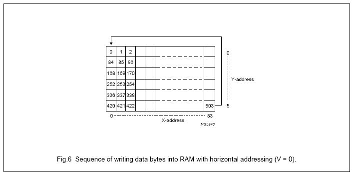 A PIC programozás megy, a PC sajnos nem annyira. Ollóztam képeket az adatlapból, szóval: 1. kép. a képernyő 6 sorból és 84 oszlopból épül fel, ez öszesen 504 byte. 1 sort 8 bit épít fel, felül az alsó bit alul az felső. Tehát ha 01010101-et küldök ki 504-szer, akkor csíkos képernyőt kapok. Kétféleképpen lehet a képernyő tartalmat kiírni, függőleges(2.kép) és vízszintes(3.kép) címzéssel. Elsőnél az egymást követő byte-ok egymás alá kerülnek, a másodiknál egymás mellé egy sorba. Mindkét módszert használom, egy programon belül is.