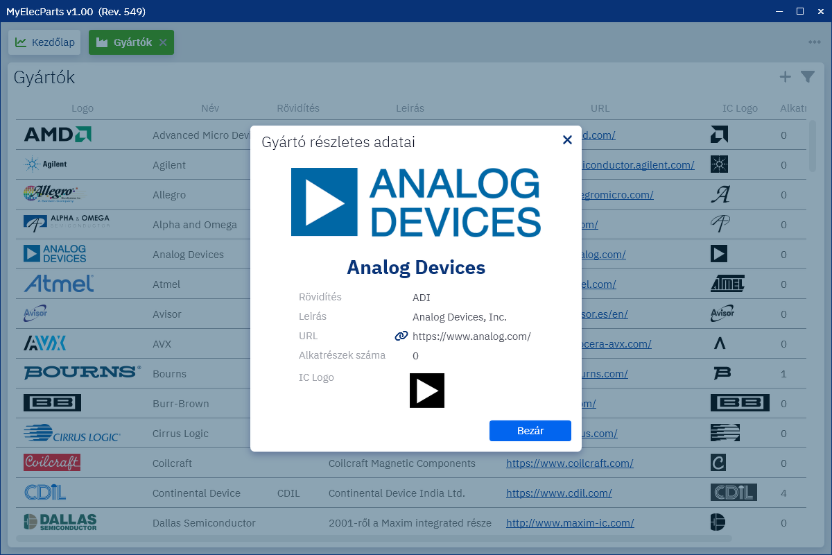 Elkészültem az elektronikai alkatrész kereső és nyilvántartó programom első nyilvános verziójával (MyElecParts v1.00). A program teljesen ingyenes, használjátok egészséggel.