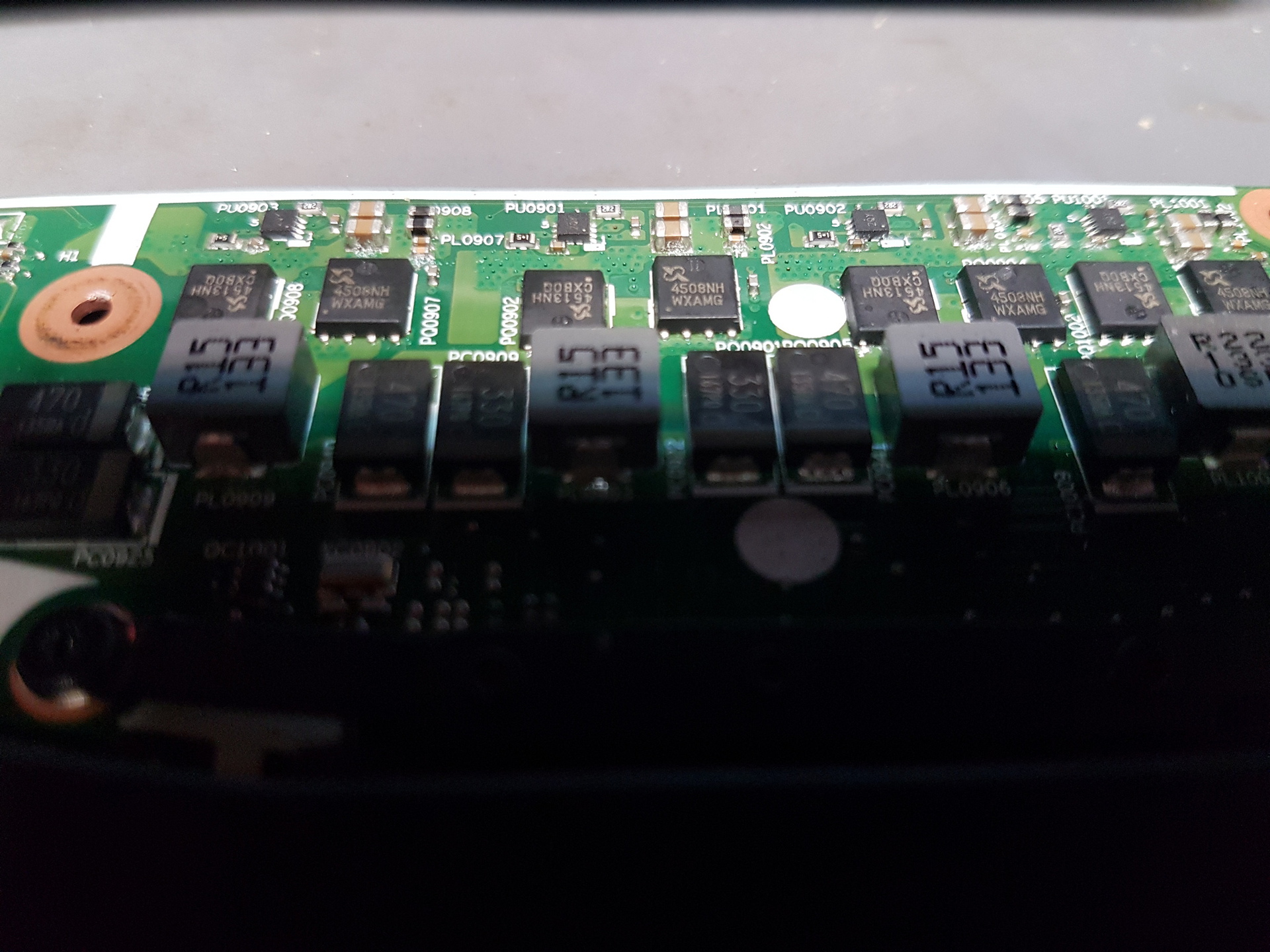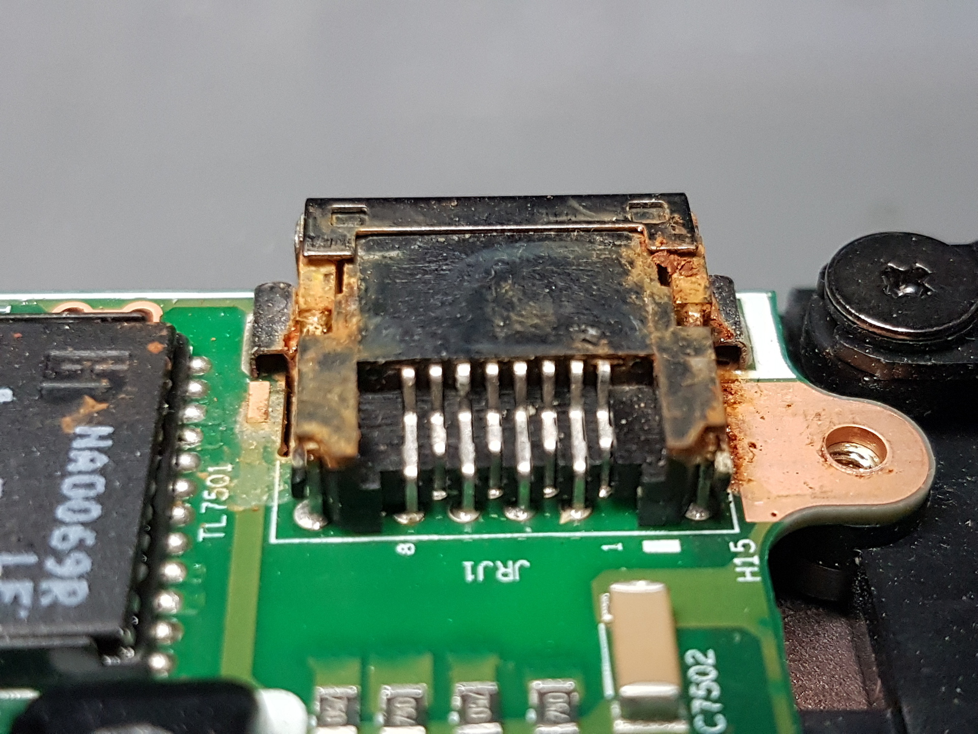 Az alaplapon is korrózió sok helyen. Az akkuja annyira "horpadtra" van leszívva, hogy 0.0 volt van benne és még labortáppal sem tudom életre kelteni. Majd kap bele egy másik akkut is, még jó, hogy van.