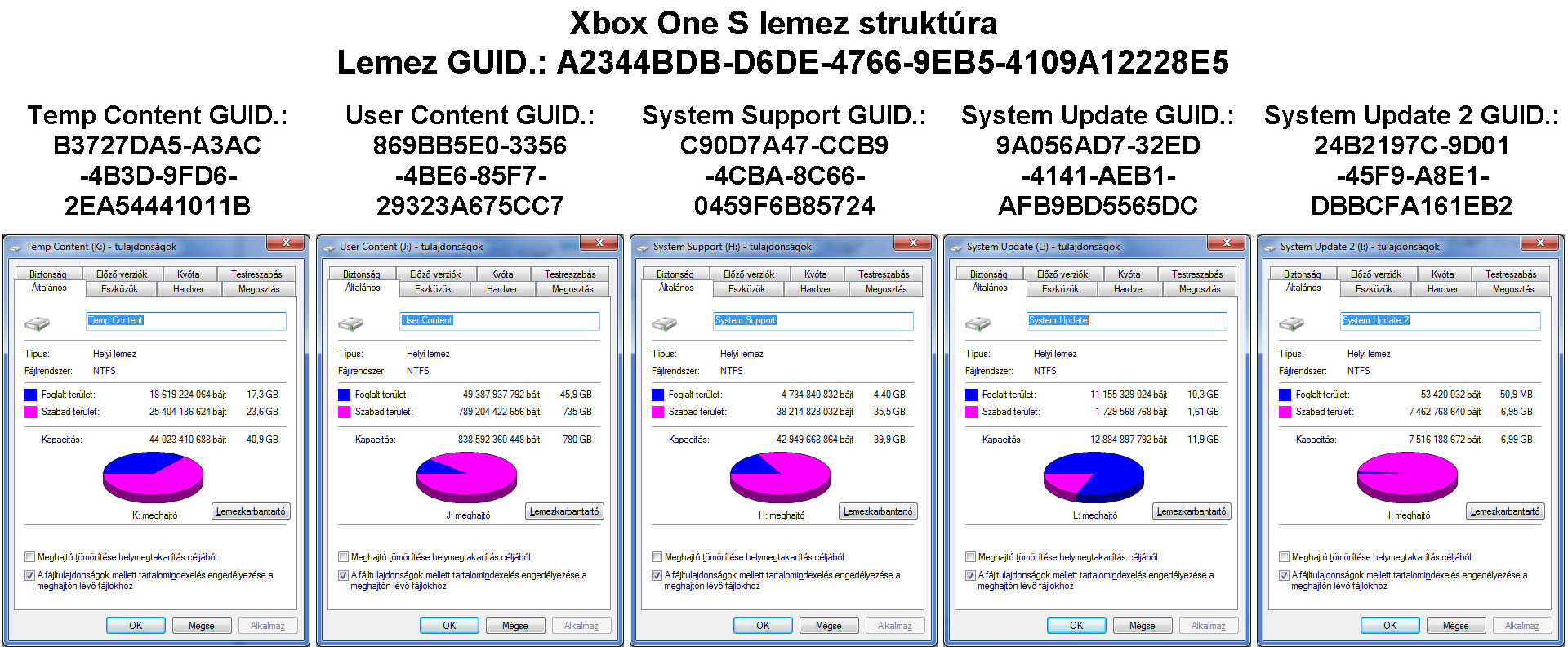 Volume 6 U Temp Conten NTFS Partition 41 GB Healthy Volume 7 V User Conten NTFS Partition 365 GB Healthy Volume 8 W System Supp NTFS Partition 40 GB Healthy Volume 9 X System Upda NTFS Partition 12 GB Healthy Volume 10 Y System Upda NTFS Partition 7168 MB Healthy GUID Device Name A2344BDB-D6DE-4766-9EB5-4109A12228E5 B3727DA5-A3AC-4B3D-9FD6-2EA54441011B U: 'Temp Content' 869BB5E0-3356-4BE6-85F7-29323A675CC7 V: 'User Content' C90D7A47-CCB9-4CBA-8C66-0459F6B85724 W: 'System Support' 9A056AD7-32ED-4141-AEB1-AFB9BD5565DC X: 'System Update' 24B2197C-9D01-45F9-A8E1-DBBCFA161EB2 Y: 'System Update 2' A 128-ason ez azt jelenti, hogy lesz egy 41gigás temp, 40gigás system support, 12gigás system update és 7gigás system update2, a maradék meg user content, amire kb. 20giga marad. Próbára elég ez is, hosszabb távú megoldásnak legalább egy 256-ost kell belerakni. Ha nem akarod használni a szkriptet, magad is létre tudod hozni ezeket a partíciókat a DISKPART eszközzel és a fenti azonosítókat is meg tudod nekik adni, nem csak a címkéket a SET ID=<GUID> utasítással. Átolvastam a batchfájlt, amit linkeltem, pontosan az kell neked, hogy ne magad vesződj vele. Az "a" - automatikus - opciót kiválasztva automatikusan kiszámolja mekkora hely marad a user content partíciónak és úgy hozza létre, ahogyan kell. Szépen töltsd csak le, rakd be az SSD-t, aztán már teheted is be az xbox one-ba. Biztosan működik, kipróbáltam már olyan géppel, amiben az eredeti HDD már teljesen döglött volt. A hozzászólás módosítva: Nov 23, 2024