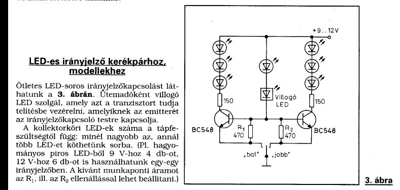 A kerékpáros indexlámpában a soros áramkorlátozó ellenállást kell 12V-ra méretezni. A ledeken eső feszültséget vehetjük átlag 1,5V-nak, 20mA-es árammal számolva. Ekkor az ellenállás értéke: 525R, 520R.