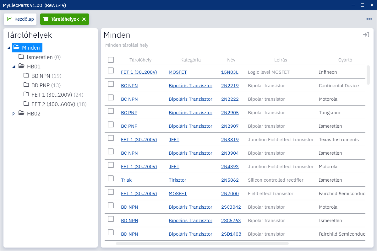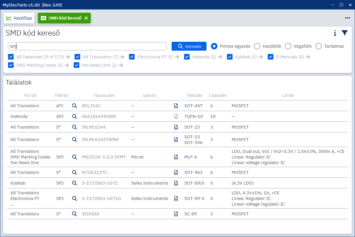 MyElecParts v1.00Sziasztok,Elkészültem az elektronikai alkatrész kereső és nyilvántartó programom első nyilvános verziójával (MyElecParts v1.00). A program teljesen ingyenes, használjátok egészséggel. Letölthető innen: https://myelecparts.hu/ A program fórum témáját itt találjátok: Bővebben: Link Ott már korábban mutattam pár dolgot, hogy mit is tud, de röviden összefoglalva: Ez egy elektronikai alkatrész nyilvántartó amiben egyszerűen rögzíteni lehet az alkatrészeket a szokásos paramétereikkel együtt. A paramétereket azután fel lehet használni az alkatrészek keresésében, szűrésében. Beépített PDF nézegetőt tartalmaz, így az az alkatrész részleteinek megtekintésekor azonnal megnyílik annak adatlapja vagy kép csatolmánya is. Ezeket fájl tallózáson kívül vágólapról és drag and drop technikával is hozzáadhatóak. Az alkatrészek tárolási helye is megadható hierarchikusan, így később könnyen meg lehet találni, hogy a valóságban hol is van az alkatrész. Az alkatrészek egyszerű rögzítéséhez ott van a meta kereső, ami a típusszám megadása után online forrásokban megkeresi az alkatrész tokozását, gyártóját, adatlapjait és diszkrét félvezetők és egyes integrált áramkörök esetén a jellemző paramétereit is. A megfelelő találat kiválasztása után csak pár klikk és az alkatrészünk rögzítve van minden begyűjtött paraméterével. A programban van még egy kereső funkció az SMD alkatrészekhez az azokra írt kód alapján. Ez is online forrásokat látogat meg, a találatokat összegzi, csoportosítja, kiegészíti lábszám adatokkal és tokrajzokkal és segít megtalálni az eredeti típusszámot. A hozzászólás módosítva: Dec 1, 2024