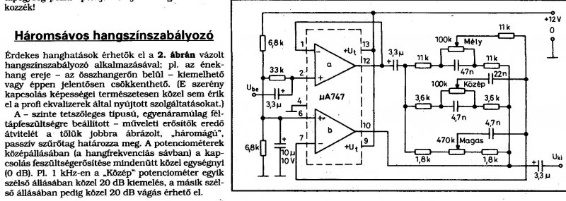 azért baxandall,mert igy hivták aki kifejlesztette ezt a szűrőtipust,többféle vátozatban épithető.lényege hogy a visszacsatolásban van és alacsony impedanciás hajtást igényel a jó hatásfokhoz.ezért is igényli a dual műveleti erősitőt.az egyik ellátja a az alacsony impedanciás hajtást és a bemeneti jel csatolását--"a" jelű erősitő,a másik pedig magát a hangszinszabályzást végzi "b" erősitő.örülök hogy segithettem