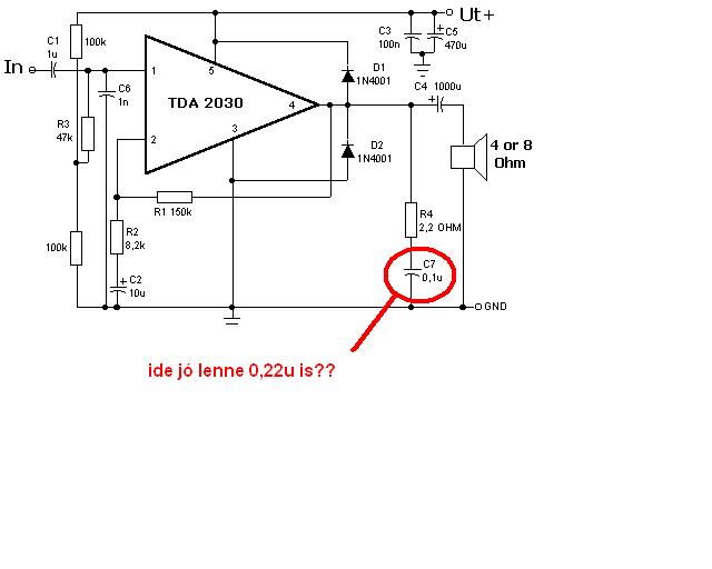 sziasztok! gyors segítségre lenne szükségem, a helyzet a következő: nagy nehezen fél év után eljutottam egy elektro boltba, megvettem a tda2030-hoz a kellékeket azaz majdnem mind, mert egy kondit elfelejtettem...:S csatolok egy képet hogy melyikből szenvedek hiányt és a kérdésem a következő lenne hogy lehet-e a 0,1µF helyett 0,22µF-os kondit tenni mert azt tudok bontani... választ köszönöm szépen előre is!