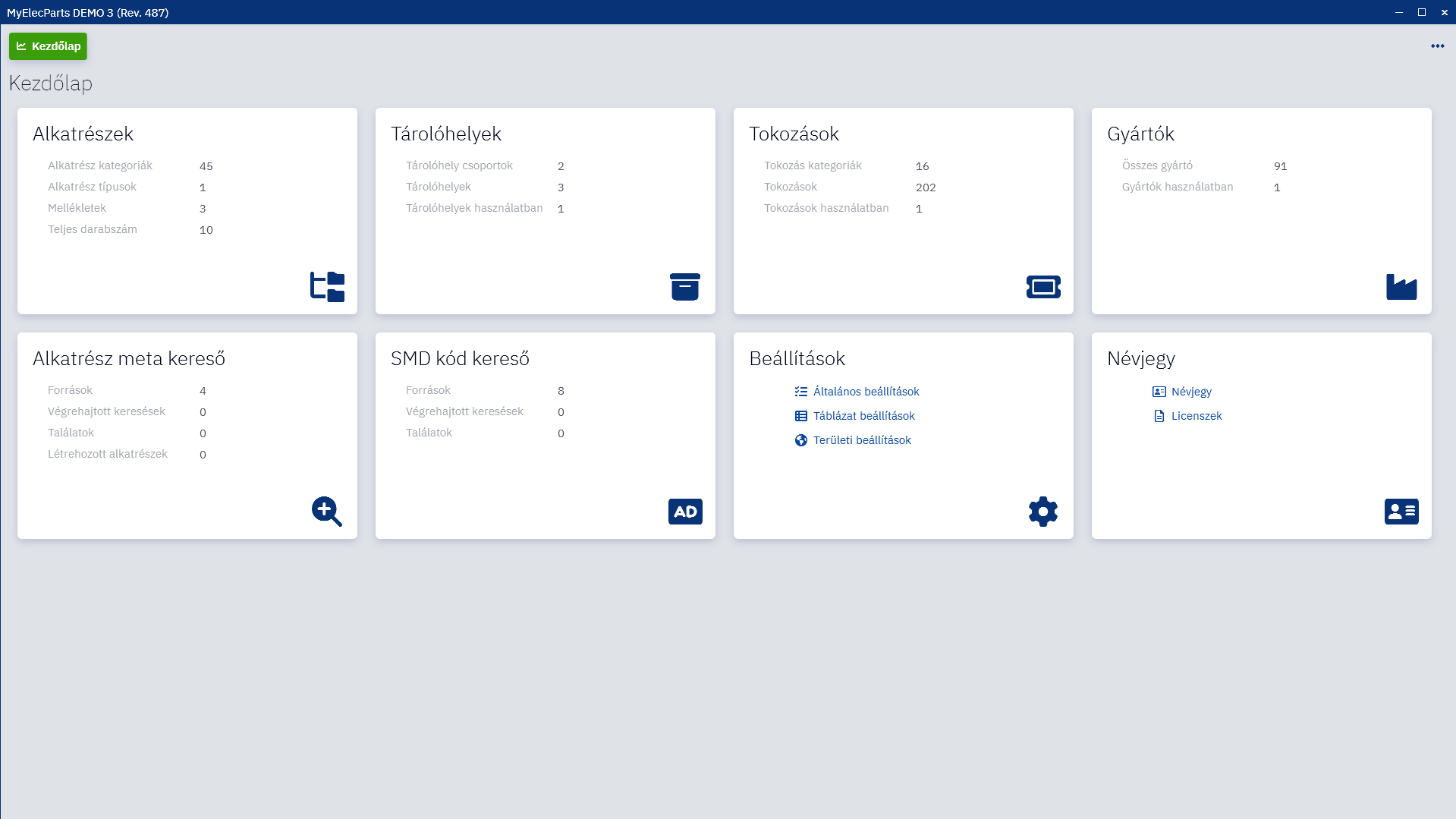 A demóban minden funkció elérhető, viszont minden adatbázisba mentett dolog az újraindítással törlődik. Az adatbázis mellett a mellékleteket, képeket fájl rendszerre menti, ezért ha kitörölsz például egy tokozást, az a következő indításkor újra létezik de már kép nélkül. És fordítva is, ha létrehozol egy alkatrészt mellékletet, az alkatrész eltűnik, a melléklet az ott marad a file rendszeren.