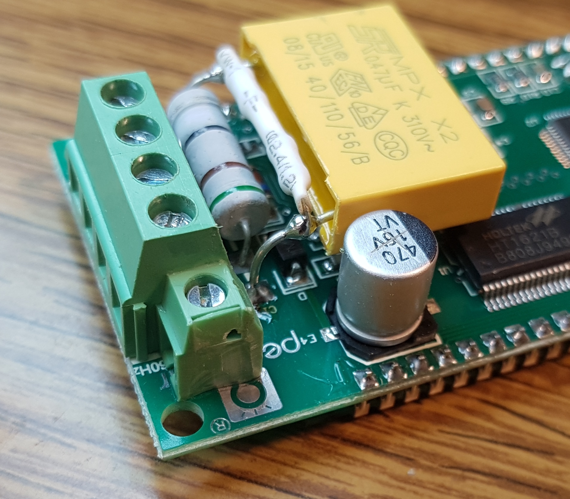 Nekem annyiban tér el a tiédről, hogy a tápellátás soros kondenzátorának csatlakozó felőli lába nincs beforrasztva, hanem az egy hátsó kivezetéses sorkapocshoz direkt van forrasztva. Így a panelen sem vágtam át a fóliát.