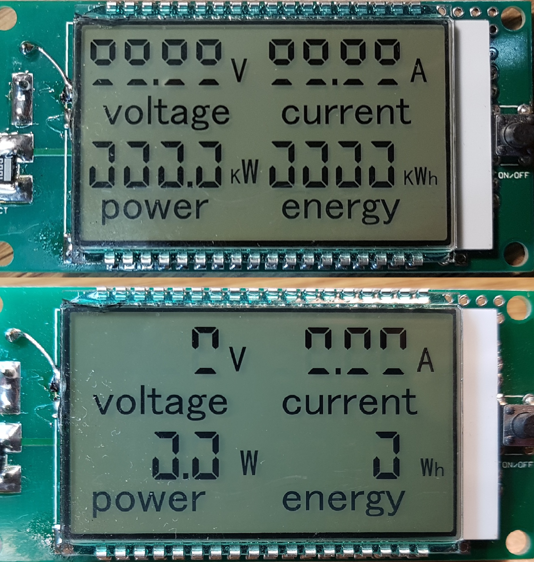 2. Egy másik mérőegységet is átalakítottam. Ez egy régi, már sokat használt darab volt, és korábban jól működött, most viszont nem próbáltam ki az átalakítás előtt. Azonos módon csináltam mindent, kivéve hogy itt most kivettem az 1 µF-os kondit, és helyette egy 470 nF-ot tettem be. Minden simán ment, igyekeztem kellő körültekintéssel végezni a manővert. Látszólag minden rendben is volt, de a kijelzőn nem világít minden szegmens. A felsős sorban a "c-e" szegmensek, az alsóban az "f" nem világít. A többi funkció működik. A mellékleten a hibás állapot fölé lefotóztam a bekapcsoláskori "minden világít" állapotot is. Lehet ezzel még valamit kezdeni? (Kicsit átalakítottam az asztalomat az AC tápegység elhelyezéséhez. És ha már lepakoltam róla, akkor a régi,erősen használt asztallapot is kicseréltem, csináltam egy kis háttérpolcot, és a sok éve nem használt holmikat már nem is tettem vissza -sosem fog kelleni alapon-. Ezért a sok pakolászás miatt érhette a mérőegység kijelzőjét mechanikai hatás, de a rajta lévő vastag "üveg" miatt nem gondolnám ezt hibaforrásnak. 3. A 470 nf-os előtéttel AC70V-ról még stabilan elindul (ezt azért ki tudtam próbálni). A hozzászólás módosítva: Dec 7, 2024