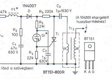 A gyújtótrafóval az a gond, hogy a szekunder tekercs elszigetelése nem szimmetrikus, ezeknek az egyik vége a primerhez/testhez van csatlakoztatva. Ide egy tisztességes kimeneti trafóra lenne szükség, úgy mint ez a Makrai aminek a teljes szekunder oldala el van szigetelve a primertől a nagyfeszültségű üzemi fesznek megfelelően: Makrai Addig nincs probléma a gyújtótrafóval, amíg vagy a hálózati földre vagy egy független földelőre csatlakozik a "negatív"/közös pontja, mert akkor a biztonsági trafó szekunder oldalán is rögzítve van a potenciál a földpotenciálhoz. Az egyetlen nagyfeszültségű kimenetnél pedig ahogy növekszik a menetszám, egyre jobban el van szigetelve a közös ponttól, tehát ezzel alapesetben nincs probléma. Probléma akkor van, ha úgy van bekapcsolva a villanypásztor hogy ez a szekunder oldali földelés épp nincs bekötve, vagy üzem közben megszakad és a kimeneti oldal és a föld között alacsonyabb ellenállás van, pl. párás idő, vagy a gaz miatt kvázi letestel. Akkor a gyűjtótrafó közös pontja kerül valamilyen +-nagyfeszültségű potenciálra a földhöz képest, vagyis ez a földpotenciáltól nagyban eltérő potenciál egészen a biztonsági trafó szekunder oldaláig jelen lesz, aminek a szigetelését terheli, mert az a hálózati feszre van méretezve meg az előírt lökőfeszültségekre, de egészen biztosan nem 10kV üzemi feszültségre, hogy annak elválasztásáról gondoskodjon. Ha pedig ez a szigetelés bármilyen okból megsérülne, akkor a hálózati feszültség is kikerülhet a gyújtótrafó primer körébe, sőt mivel közös pontja van a szekundernek, ezért még a teljes kerítésbe is. Igen, ezt a fajta biztonsági trafót meghajthatnád kétvezetékes kábellel mert nincs földelési pontja a vasmagnak sem, de ott van egy fémlemez a teljes műanyag dobozban, pár milliméterre a hálózati betáp beforrasztása alatt. Valószínűleg csak szerelőlapnak szolgált a gyújtótrafó rögzítéséhez, meg némi árnyékolást ad, de ha a hálózati PE erre csatlakoztatva van akkor a gyújtótrafó primer köre is csatlakozik hozzá és ez volt a közös földelés. Ha erről lekötöd és a különálló kimeneti földelést alakítod ki, akkor megvalósítható a szabvány szerinti előírás a különálló földelőkkel, ugyanakkor a kimeneten bekövetkező földelési hiba esetén nem csak nagyobb esély lenne a biztonsági trafó megsérülésére, hanem kapásból a hálózatba is át tud ütni a néhány mm távolságon a fémlemezről. Másrészt mi van ha leesik a doboz és véletlenül hozzá tud érni a fémlemez ezekhez a forrasztásokhoz? (A hálózati földdel legalább működésbe lépne a biztosító, bár a csavar alá kötés is megér egy misét). Ezt a betápos rész alól ki kellene vágni, vagy legalább egy 2-3mm-es tömör műanyag/gumi szigetelőlapot oda kellene tenni. A trafó elé sem ártott volna egy üvegcsöves bizti. A kimeneti földelés függetlenítését meg tudod oldani a mellékelt kapcsolási minta alapján. Remélhetőleg ez a gyújtótrafó meghajtásának topológiája és nem a közös és a föld között van a tirisztor. Csak úgy szabad bekapcsolni, ha a kimeneti földelés rendesen be van kötve és megfelelő szonda lett leverve. Ehhez a konstrukcióhoz mindenképpen ajánlom, hogy szerelj be egy A típusú ÁVK-t ha nincs, akár csoportosan az egész épület számára, ami ezt a leágazást is védeni fogja (dugaljakhoz amúgy is kötelező most már). A 2.1.9-es pontban említett túlfeszültségvédelem valószínűleg nem a 230-as betáp oldalra vonatkozik, hanem a mellékelt kép szerinti szikraközre. A "karám tápvezetéke" alatt már a nagyfeszültségű oldal értendő, mert utána a karám "áramszolgáltató egységének" kimeneti feszültségét említi és arra az esetre vonatkozhat, ha ez a tápegység beltérben helyezkedik el, de a nagyfeszvezeték a kültéri kerítéshez megy. Lehet, hogy nem írja elő semmi a kisfeszültségű oldal felőli túlfeszültségvédelmet. Plusz költségeket sem akarok javasolni, ezért mint ajánlás mondom, ha semmi sincs telepítve az épületben, akkor ártani nem árt az általános elvek alapján történő kiépítése és ha a központi elosztóban van a készülék, akkor az valamilyen szinten védelmet nyújt mind a hálózat felől jövő túlfeszültségektől, mind más kültéri kábelektől, úgymint a villanypásztor. A földelésnél talán nem volt teljesen érthető, de ha nincs a kerítés közelében helyi földelő, akkor bármilyen túlfeszültség kénytelen lenne megkeresni azt ami adott, jelen esetben a betápkábelen biztosított PE, amit visszakövet a lakáselosztón keresztül az épület földeléséig/PEN-ig. Tényleges villámáram valószínűleg sosem fog benne keletkezni, mert előbb párologna el az a vékony huzal a kerítésről, de ha mégis keletkezne bármilyen túlfeszültség, akkor azt jobb a képen lévő levezetőig engedni és ott a földbe levezetni. Nem tudom mi a szokás, milyen túlfeszültségre lehet számítani, lehet hogy 10x10m kert esetén nem szükséges (ha van az mindig csak előny), csak egy 100x200m-es legelő esetén. Bár önmagában nem lenne előnytelen, ha mind hasonló készüléken lenne egy korlátozó szikraköz. Aztán a gyakorlat meg boríthat mindent. Mi van ha a kerítés a háztól kezdődik és adott hogy oda kerüljön a homlokzatra a villanypásztor. Akkor csak a földelést tegyük távolabb, hogy teljesüljön a szabvány, de akkor a kerítés nagyfeszbetápját is oda illene elkábelezni, mert a nagyfeszültségű túlfeszvédelemnek a földeléstől távol kevesebb értelme van.