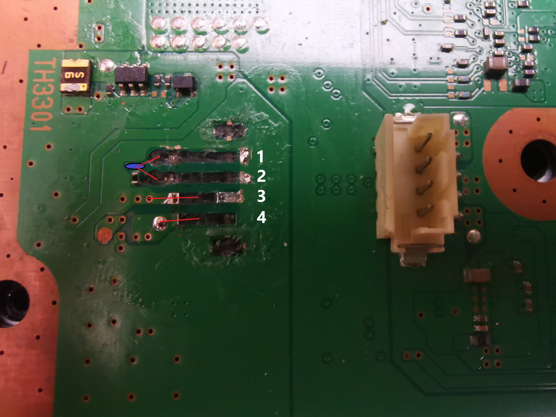 PlayStation 3 FAT (CECHL04) típusú gépből kiszakadt a tápegység csatlakozó az alaplapból (4 pin). A forrasztási pont nem forrasztható, nagyon sérült. A csatlakozó leszakadása előtt a gép működött. Valaki ki tudná mérni multiméterrel, hogy a leszakadt 4 pin hová köthető be az alaplapon? Örülnék, ha valaki lenne olyan kedves és ilyen készüléke van, multiméterrel megmérné (nulla vagy közel 0 az érték), hogy a bekötési pontok az alaplapon (1-2-3-4) milyen más pontokkal vannak közvetlen kapcsolatban, akár SMD ellenállás-kondenzátor, stb. A 4-es vizsgálati pont az megvan, a 3-as talán az, amit az utolsó képen jelöltem. Előre is köszönöm szépen a segítséget! ?