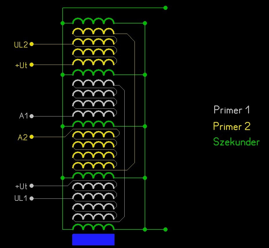 Lerajzoltam a kimenőd elektromos rajzát, nyilván a mechanikai rajza az teljesen máshogy néz ki, azt most nincs időm lerajzolni. Illetve, ugye ez egy PP trafó, nekem hasonló elrendezésben (SMPS gate trafó) voltak olyan tapasztalataim is, hogy nem mindegy a két ellenütemű tekercs menetiránya sem, mert nem mindegy hogy hogyan hatnak egymásra kapacitíven. Volt olyan eset, ahol nem volt jó az, hogy csak megtekerem a tekercseket, majd az ellentétes végeket összekötöm, mert egymásra nyitottak a fetek, hanem a tekercselés irányát is meg kellett fordítani a csévén. Kimenőnél nem tudom ez mennyire számít mert még nem próbáltam (drága lett a drót, meg borzalmasan utálok trafót tekerni).