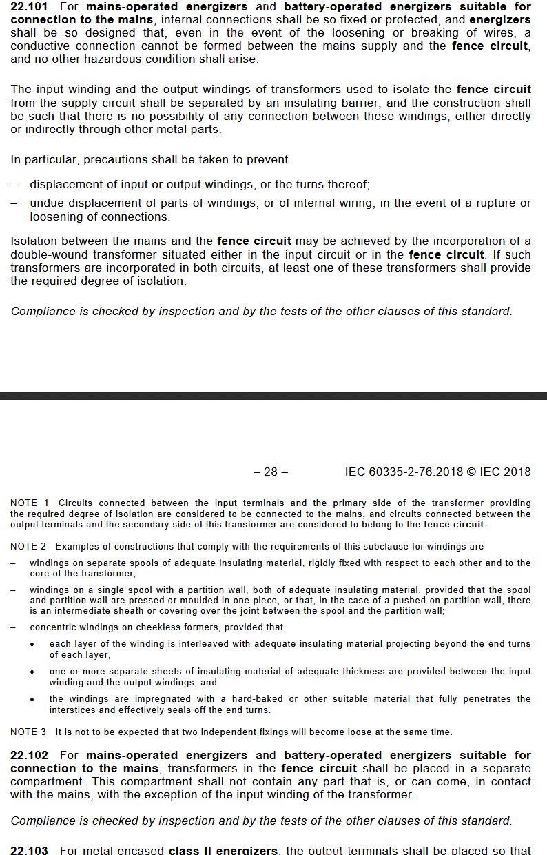 A direkt hálózatról töltés nem hangzik túl jól, de egyébként az még talán hivatalosan is megvalósítható, feltéve hogy a nagyfeszültségű kimeneti trafó aztán tényleg megfelel minden követelménynek. Ezért raktam be képként az angol szabványrészletet, mert az a legfontosabb rész a kivitelről és az elválasztásról, nem megy mindig olyan jól az angol. Az egyik, hogy a bemenet és a kimenet között nem lehet fémes vezetőkapcsolat. A másik, hogy egy két tekercses transzformátornak kell gondoskodnia az elválasztásról, ami lehet a hálózati részen (ekkor ez egy 230/valami trafó), lehet a kimeneti-kerítés részen (ekkor ez a nagyfesztrafó), vagy lehet egyszerre mindkettő beépítve, viszont ezek közül VALAMELYIKNEK meg kell felelnie a szabvány által támasztott legmagasabb szigetelési követelményeknek. Nyilván az eleve nagyfeszültségű transzformátornál a legegyszerűbb megoldani, hogy bírja a névleges feszültségének kétszeresét is, valamint a túlfeszültségeket, tehát ha a nagyfesztrafó ennek biztosan megfelel és hibátlan, akkor én úgy értelmezem, hogy történhetne közvetlenül a hálózat egyenirányításával a töltés és a NF trafó meghajtása, az NF trafó biztosan és megbízhatóan elszigeteli azt a pár száz voltot a kimeneti áramkörtől. A betáp kábel beérkezése után pedig az a pár alkatrész és hálózati feszültségű rész nyilván úgy helyezkedik el a készülék belsejében, hogy kívülről az egész megfelel a kettős vagy megerősített szigetelésnek, nem hozzáférhető, nem érhet hozzá más áramköri részhez, valamint a korábban már említett követelmények, behatások hatására sem juthat ki a nagyfeszültségű trafó kimenetére. A kettős szigetelésű készüléknek nem feltétele az elválasztás, egy kézi fúrógépben és egy porszívóban sincs külön trafó, csak megfelelően erős műanyagrészek alatt helyezkednek el a veszélyes részek. Mindazonáltal a további trafó és a kisebb feszültségek/energiák használata további biztonságot ad jó tervezés esetén, valamint megint más a helyzet ha vegyes üzemet is tud és további akkumulátoros bemenete is van. Nincs mit, szép estét neked is!
