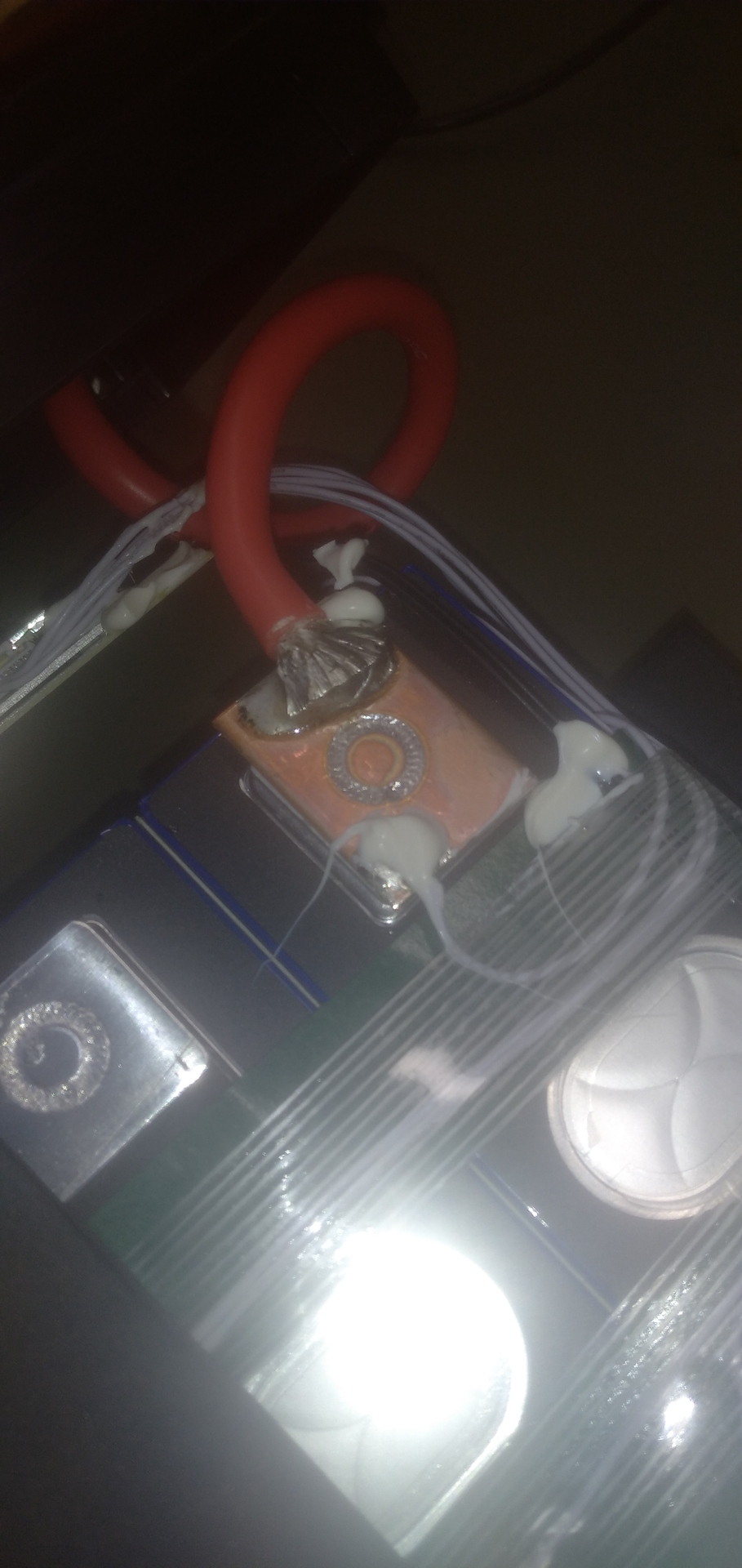 A cellák kapcsai lézerhegesztéssel vannak összekötve az átkötő lemezekkel. Azok a lemezek amik réznek néznek ki, azok cupal lemezek, alul ahol a a cella amúgy alumínium kapcsaival érintkezik ott alu, felül pedig ahol rá van forrasztva a vastag drótok ott réz. Az átkötők közepén a "pukli" az a dilatáció miatt van, hogy ha melegben tágulnak az alkatrészek méretei, akkor a puha alumínium ott tud torzulni, nem a cellák kapcsait feszegeti az erőhatás. A cellák feszültségei műszerrel mérve amúgy századra ugyan annyi. A belső drótok nagyon jó minőségűek, extra hajlékony ónozott réz szilikonszigeteléssel.