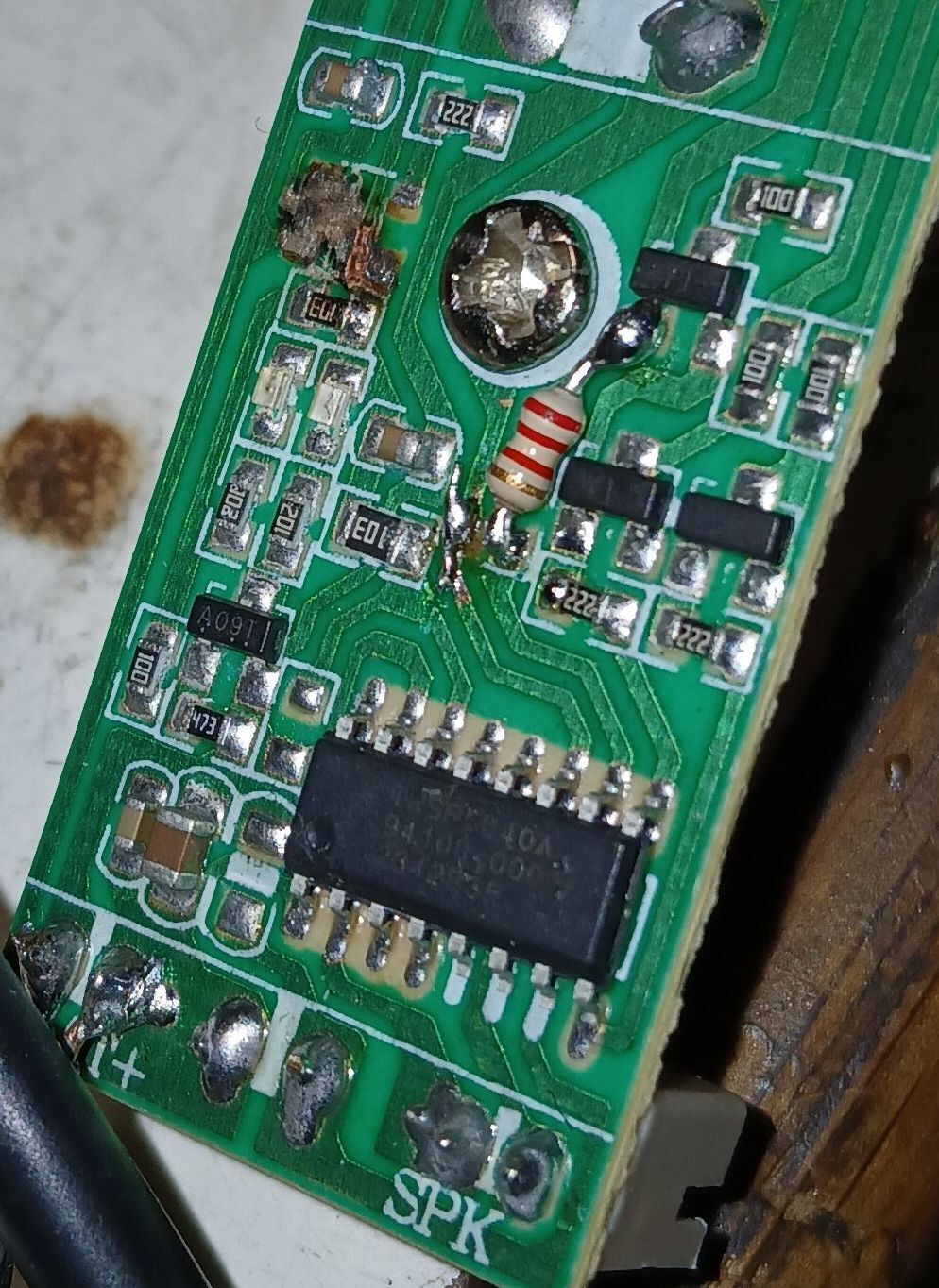 1 cellás töltőáramkör LTC4054-el, fénykardbaSziasztok!Egy ismerősöm unokájáé, ezzel "öli" tatát. Nem tudni pontosan mi történt, de a sot23-5 tokos töltésvezérlő felrobbant. 1db 18650-es 2000mAh-s akku van benne, az 0V-os. Lehetett másik adapter, ami tönkretette, vagy éppen a zárlatos akku, vagy éppen töltés közben kapcsolták be...nem tudni. A feliratból egy kezdő L betű maradt. Akár LTH7 is lehetett, ami az LTC4054 lánykori neve. Lábkiosztásban is stimmel. Illetve elég hasonló még az MCP73831/2, bekötésre, tudásra... A 4054 több, mint 2000Ft + posta, meg ugye kéne még akku is, ezt nem is próbálom meg feléleszteni. Cellám lesz bontott. Ami eszembe jutott, hogy anno egy Lidl-ös fogkefében tönkre ment a töltő IC, elő is kerestem TLC4056. 8 lábú, de ugyanazt tudja, sőt egy kicsit többet is. A fólia úgyis oda van, hackelni kell. Ahogy nézem, simán beköthető helyette, némi mókolással, jól látom? Levenném a töltőáramot 250mA-re jobb a békesség alapon. Akár még egy kis hűtést is kapna ragasztással... Egyébként van benne egy spec IC ami a hangot is adja és az RGB LED-et is vezérli, egy rugós rezgésérzékelő és egy nyomógomb alapján. Szerencsére ez a része jó. A burkolat egy fém cső, a felfogatás nem az igazi...