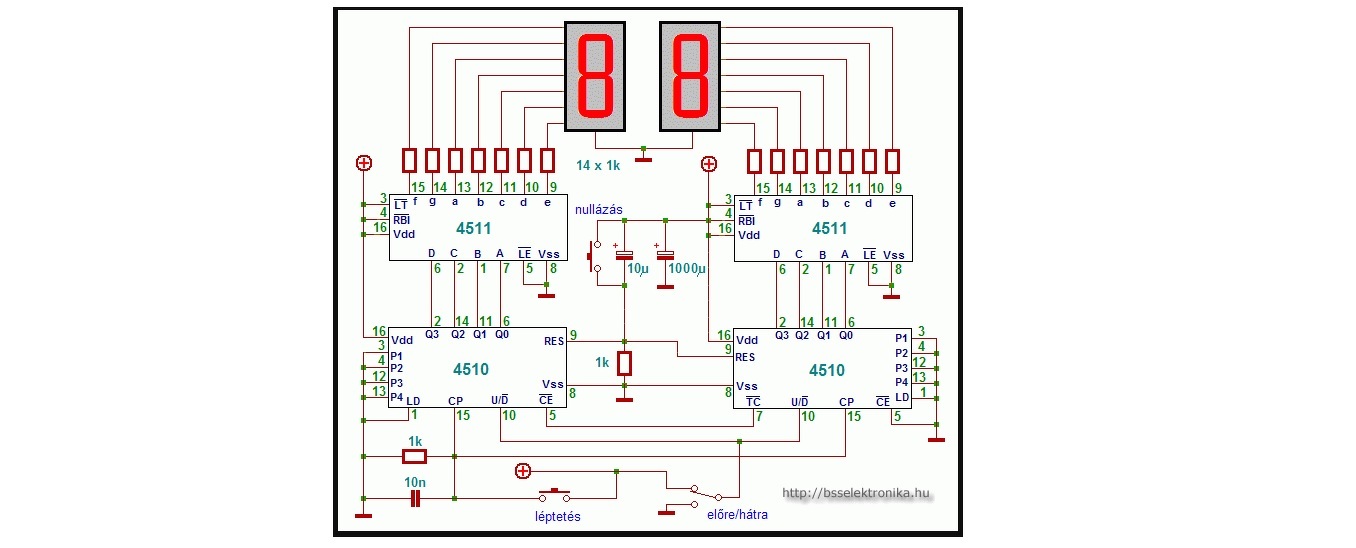 Hello! Sokkal jobban jársz egy CD40110-esIc-vel. Egyszerűen kaszkádolható, ha az alsó szám Carry kimenetét rákötöd a felső szám CLKUP bemenetére. (Ugyan így a BORROW-ot a CLKDN pontjára.) Természetesen a RESET lábakat össze kell kötni.