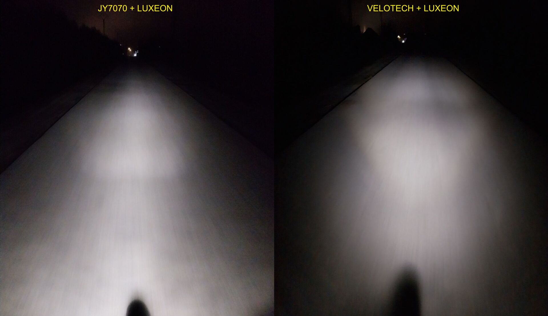 Na meg így nem tudok statikus tesztet csinálni, mivel nincs villanymotorral hajtott generátorom a valós karakterisztikájú áramforrás szimulálásához. A különböző meghajtások ellenére az össz lumen kb. ugyan annyi a két lámpánál. A tükrösnek kevésbé szélesebb a megvilágított területe, de ott nagyobb fényerő koncentrálódik a középső sávban, a környezetet meg inkább a központi területről szóródó fény világítja meg. A lencsés lámpa egyenletesebben terít nagyobb területen, messzebbre állítva ezért oldalra is jobban világít. Az úton is 1-2m-el szélesebb területet fed le. Amúgy a teljes sötétségben mindegyik bőven jól világít.