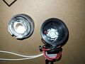 Beszereltem egy másik Luxeon ledet (L1HX-5770200000000) egy másik lencsés lámpámba és összehasonlítottam az előző tuninglámpával. Ezek a kicsi ledek ideálisabbak, mint a nagyobb feszültségű, 8-9mm átmérőjű LED, főleg a nem tükrös lámpákhoz. Egyenletesebb a fény terítése és a kis chipek sem látszanak. Egyenirányítás után közvetlenül rákötöttem a generátorra, ha nem alakul ki 6-700mA-nál több akkor bőven elfut így is, a generátor maga lesz az áramkorlát. Bár ideálisabb lenne egy buck konverterrel meghajtani, vagy legalább kettő ledet sorba kötni, mert így erősen levágja a generátor feszültségét is (kb. 3V LED + 2x0,5V Graetz), ami felesleges terhelés ill. alacsonyabb hatásfok. Az az előnye, hogy már a sétánál 3-5km/h is villódzik, ami tetszik (epilepsziásoknak kizáró ok) és előnyös az észrevehetőség miatt, meg legalább az utat is látni, szemben a másik lámpával aminek a fénye 5-7km/h-nál jön meg.