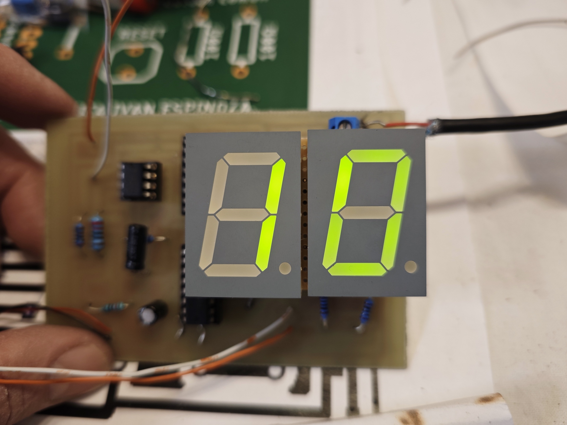 Az az ellenállás kel oda a led szegmensek áramának csökkentése miatt. De ha megfigyeled az 1 sokkal "fényesebb" mint a 8. A szegmensenkénti ellenállás egyöntetűbb fényességet adna . Értékét a meghajtó ic terhelhetősége és a led szegmensenkénti üzemi árama alapján számolható az adott tápfeszültségre.