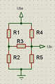 Úgy számolnám, hogy az Uki pontra felírnám az R1, R2, R3 terhelt feszültségosztó által generált feszültséget, melyet az R4 R[sub]5[/sub] terhel. Ugyanezt kiszámolnám az R4 R5 által alkotott feszültségosztóra, amit meg az R3, R1, R2 terhel. A két feszültség összege kiadja a kimeneti feszültséget.