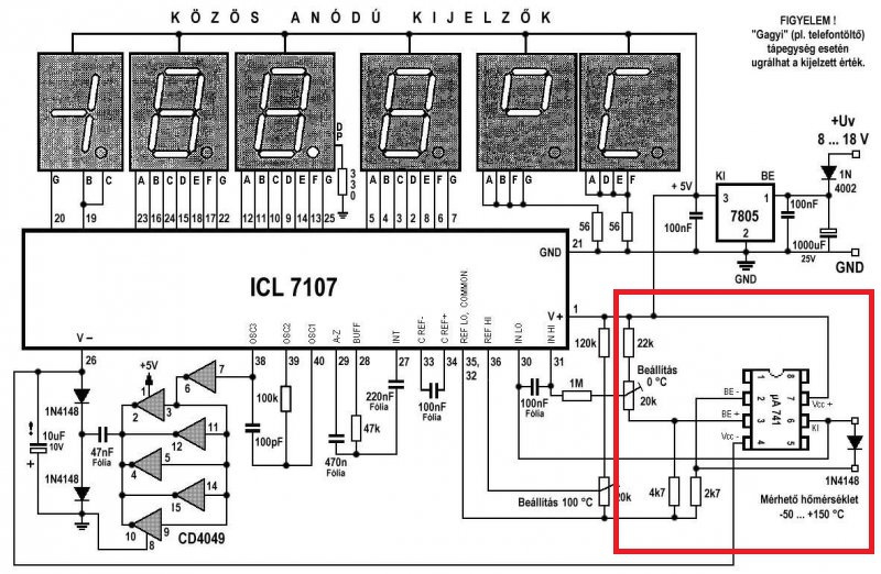 Az oka pedig az, hogy a kapcsoláshoz mind a referencia két bemenetre, mint az IN+ és IN- bemenet két pontjára szükséged lesz. De a referencia a műszerben már ki van alakítva, valamint általában az IN- pont általában közösítve van az IC COMM pontjával. (Valamint a legtöbb esetben ez a tápfesz negatív pontja is egyben, ha ICL7107 van az áramkörben.) Én megpróbáltam megrajzolni, hogyan lehet ezt pld. megoldani. De ide is +- tápfeszültségre van szükség, mert ha a műszer IN- bemenete a táp negatív pontja, akkor nem lehet ennél negatívabb pontot előállítani, csak negatív tápfesz alkalmazásával. (Ha az IN- bemenet független lenne a COMM ponttól, akkor egy 5V táppal is megoldható lenne, De várhatóan ez nem így van, mert a panelképen sem látom csak az IN+ bemenet feliratát.) Természetesen ha 150 fokig mérsz, az 150mV feszültséget jelent, Az LM358 így nem a legjobb választás, mert offset hibafeszültsége 5mV körül van. Lehetne ennél jobb (és drágább) IC-t is választani, pld. TLC272 személyében. A beállítást nulla fokon kell elsőként végezni, majd a 100 fok (vagy 150 fok) értéken. A +- tápfeszt így is ki kell keresni és kivezetni a műszerből. De értéke 3..5V között lehet bármi. A hozzászólás módosítva: Júl 16, 2021